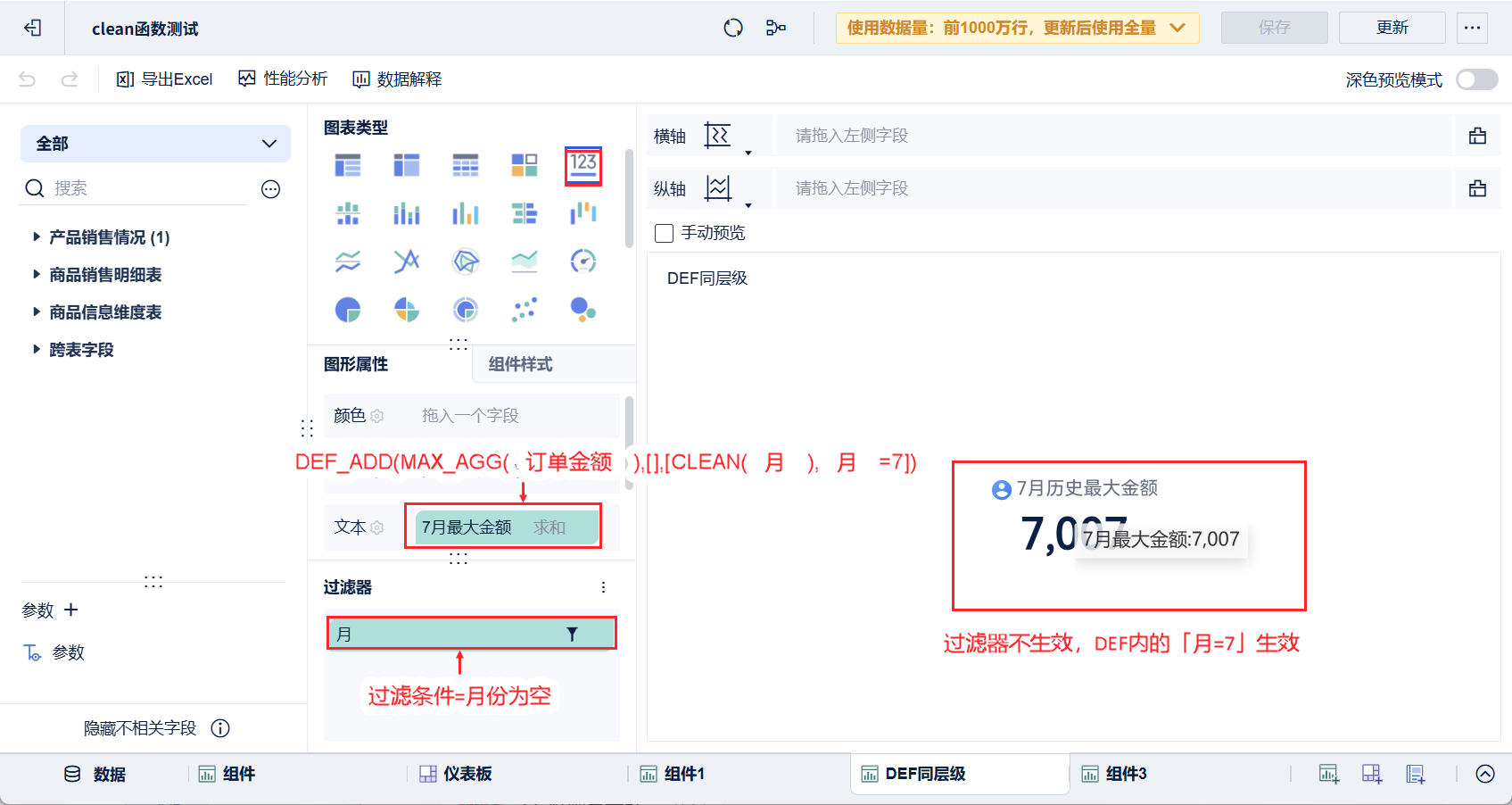 例如,def(sum_agg(订单金额),[],[ clean(月),=7]),过滤器绑定「月」过滤 ,此时,DEF 计算仅使用「月=7」进行过滤。