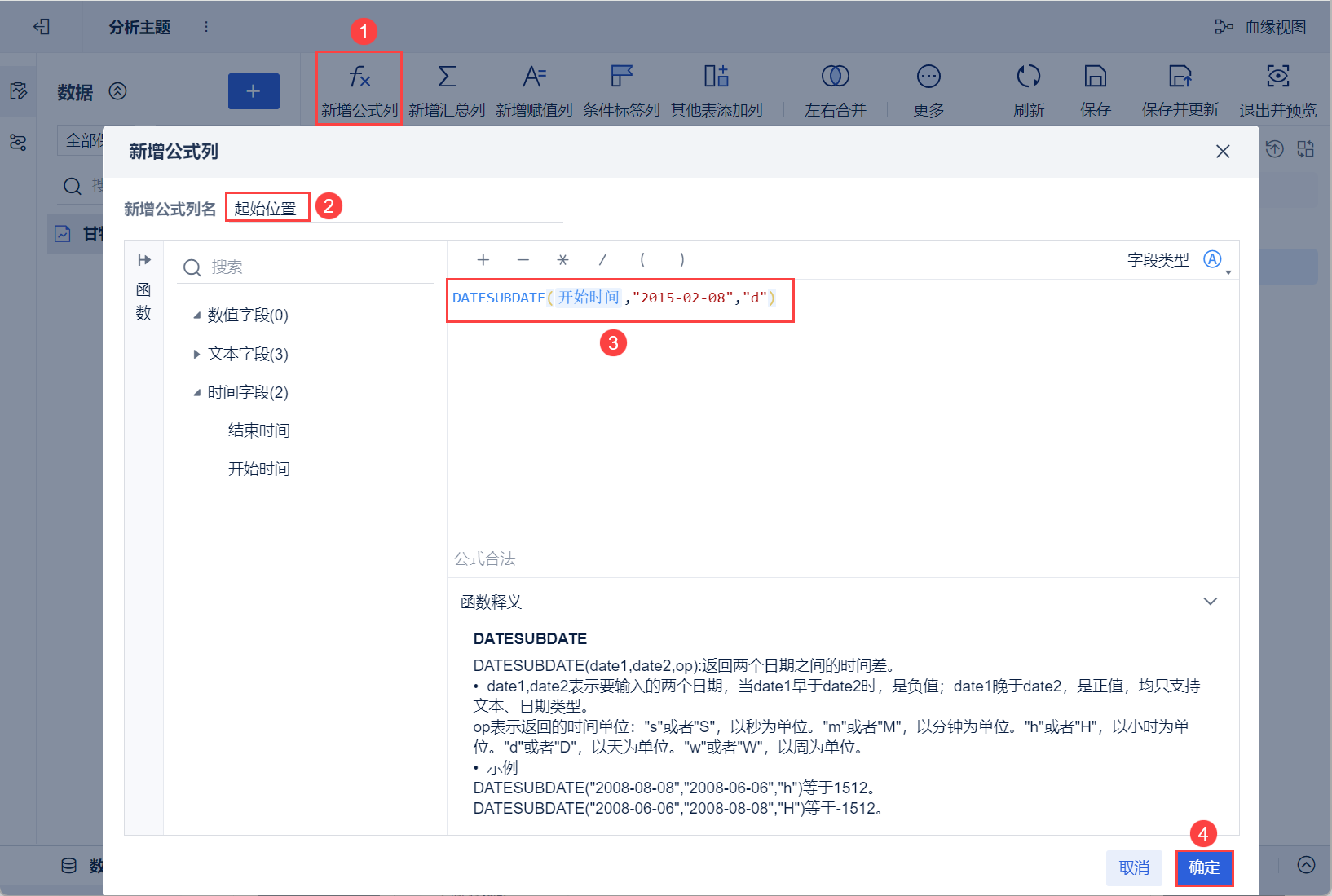 2)在弹出的新增公式列设置框中输入新增公式列名为「起始位置」,输入公式: DATESUBDATE(开始时间,"2015-02-08","d")