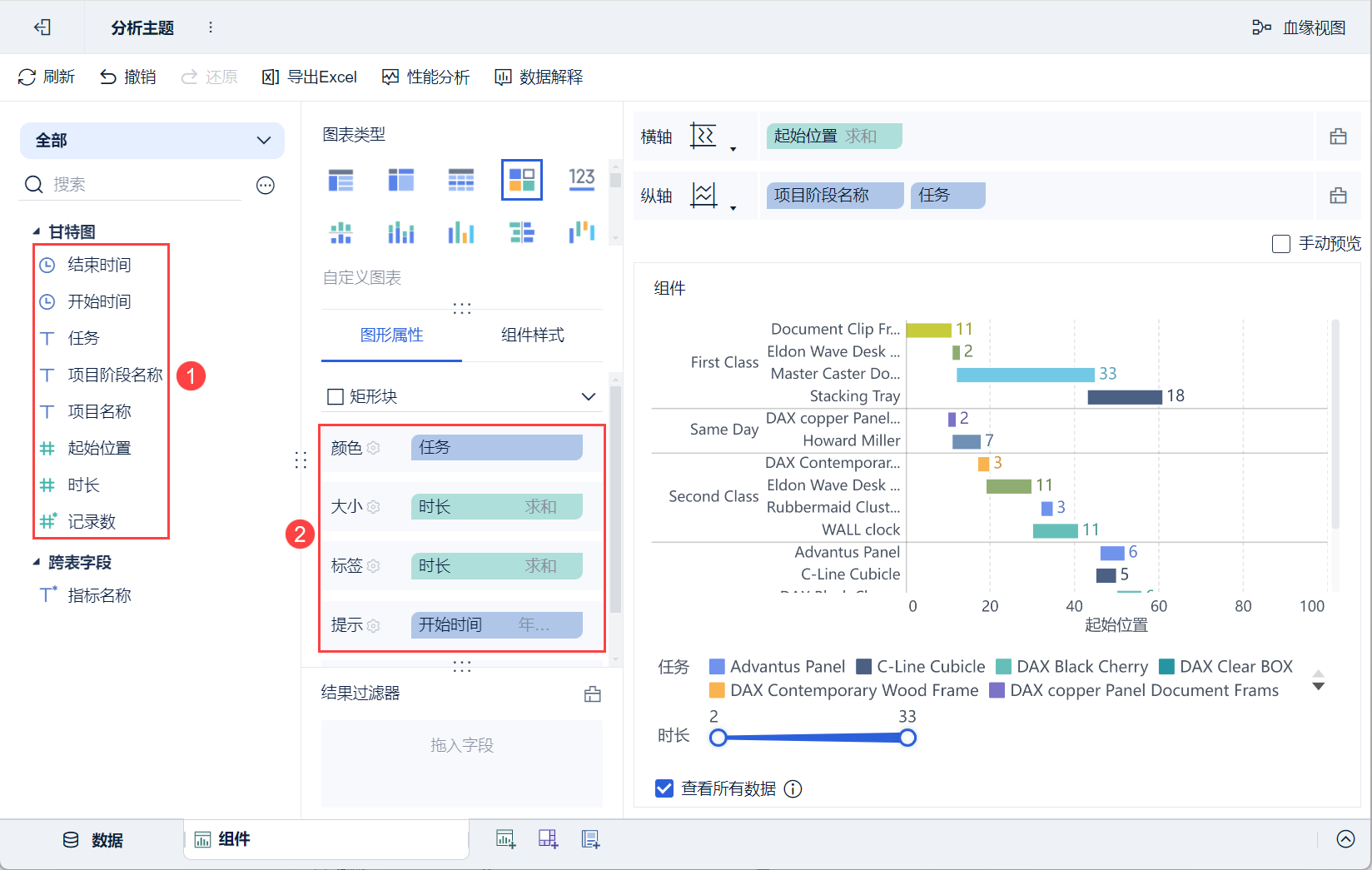 4)将左侧待分析区域的「任务」、「时长」、「时长」、「开始时间」分别拖入「图形属性」下的颜色栏、大小栏、标签栏、提示栏,即可设置不同任务显示为不同的颜色,不同时长显示为不同的长度,显示时长标签,点击矩形块提示开始时间,如下图所示:
