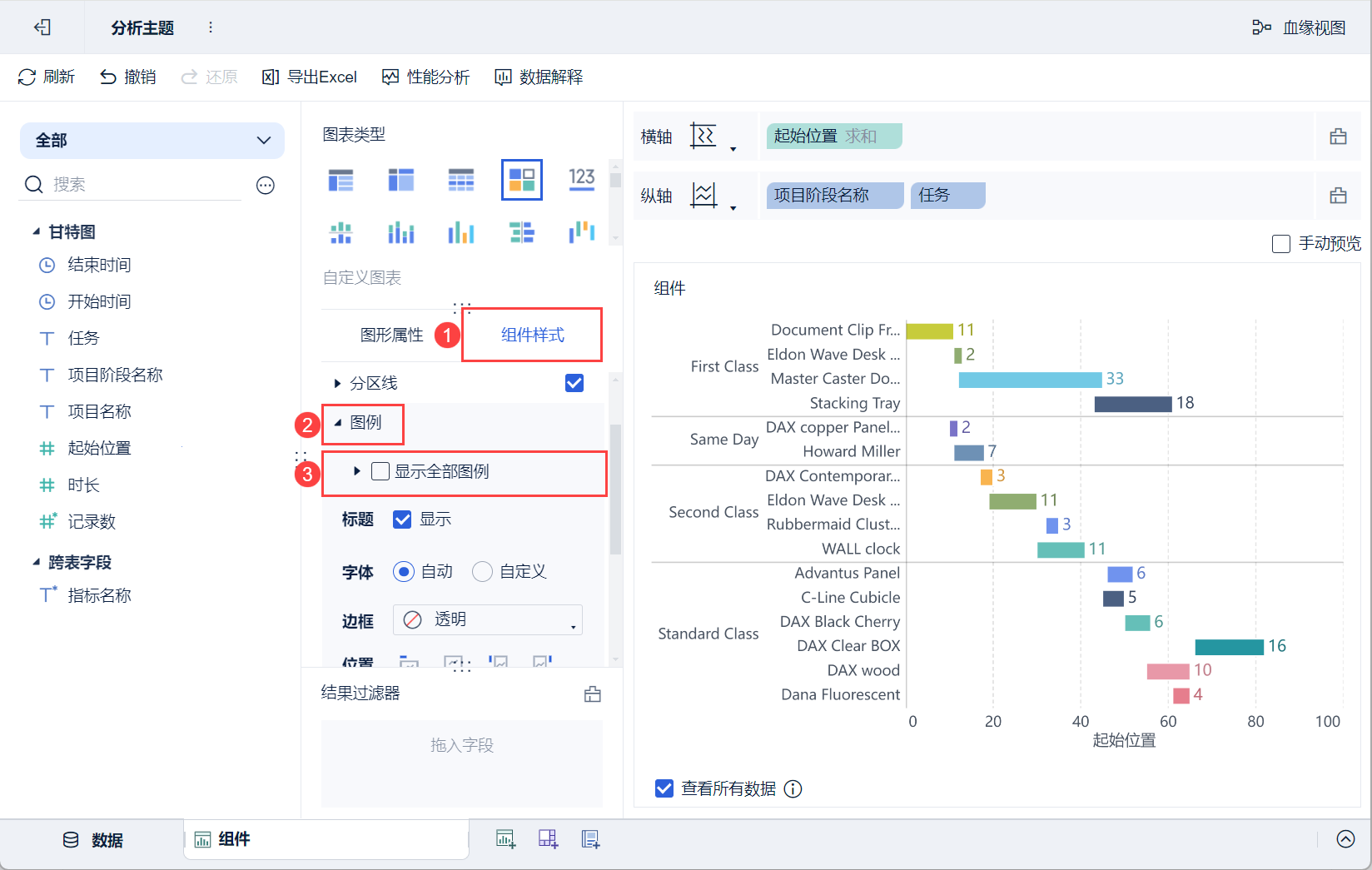 3)将左侧待分析区域的「起始位置」拖入分析区域的横轴,「项目阶段名称」、「任务」拖入分析区域的纵轴,如下图所示: