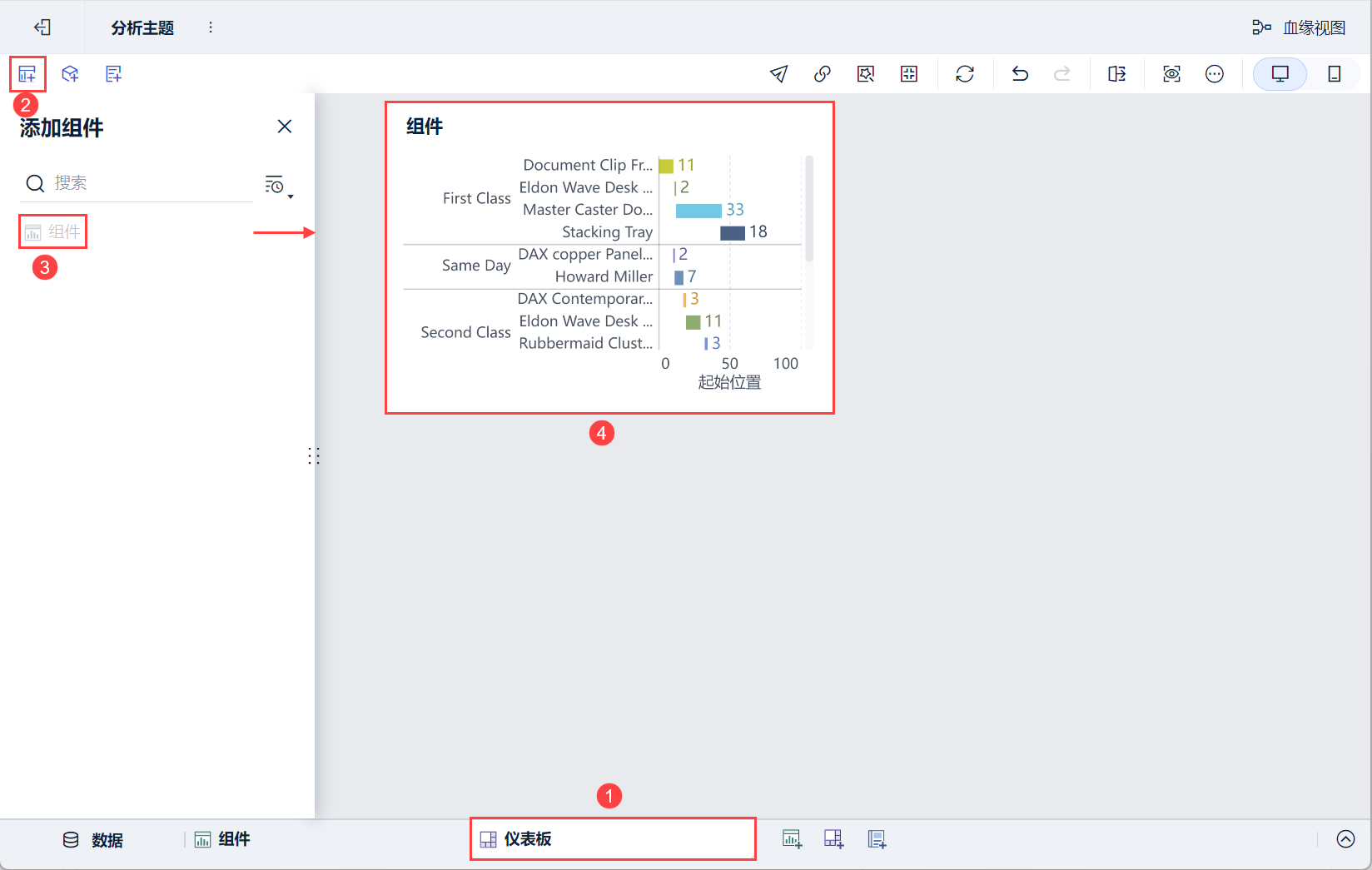 2)进入仪表板编辑界面,将组件拖入至仪表板中。