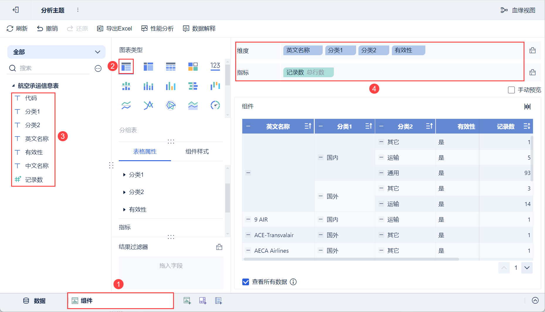 3)将左侧待分析区域的「英文名称」「分类1」「分类2」「有效性」拖入维度栏,「记录数」拖入指标栏,如下图所示: