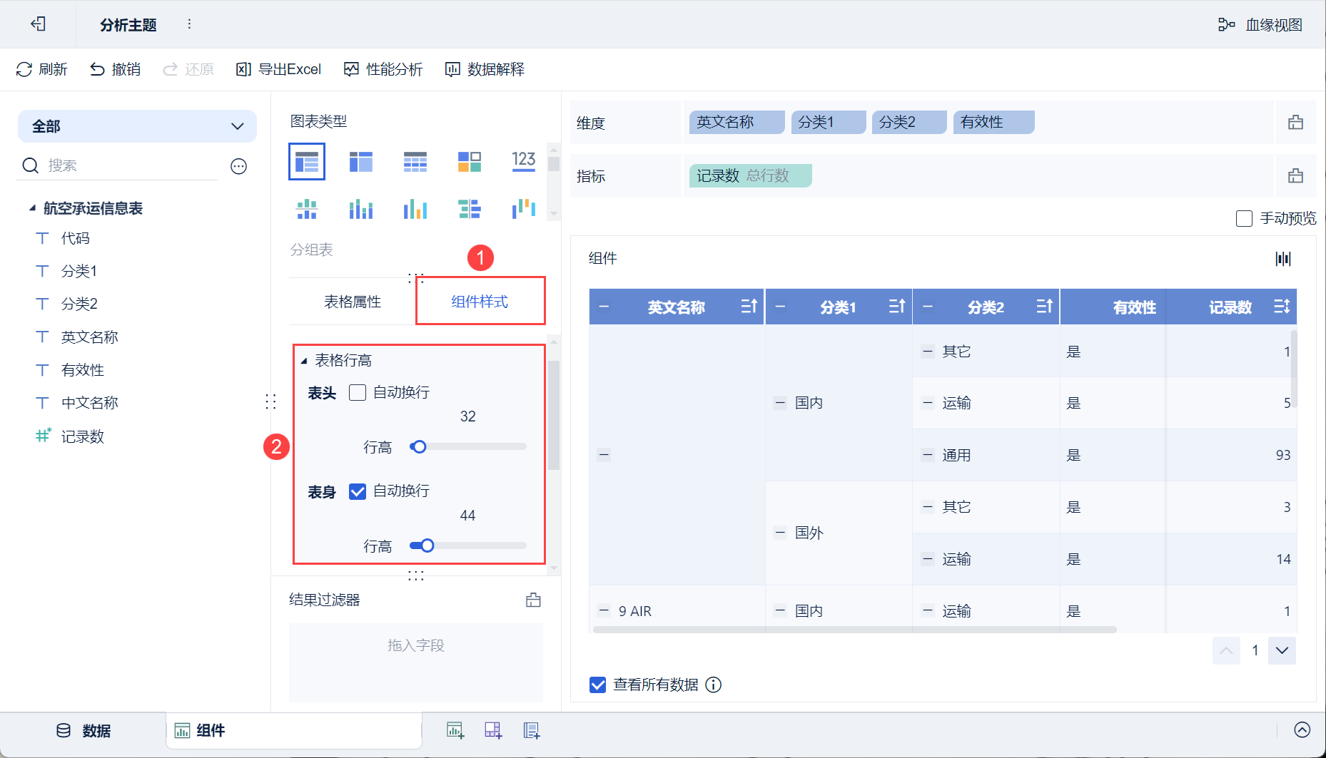 使用「组件样式>表格行高」功能,即可对「表头」和「表身」是否自动换行、行高进行设置。