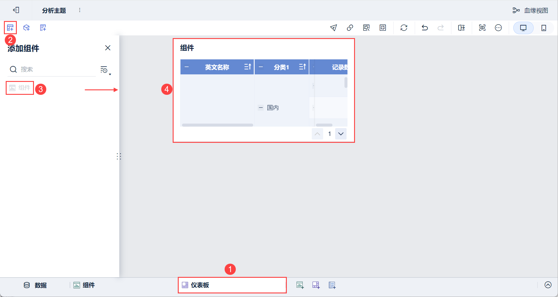 2)进入仪表板编辑界面,将组件拖入至仪表板中。如下图所示:
