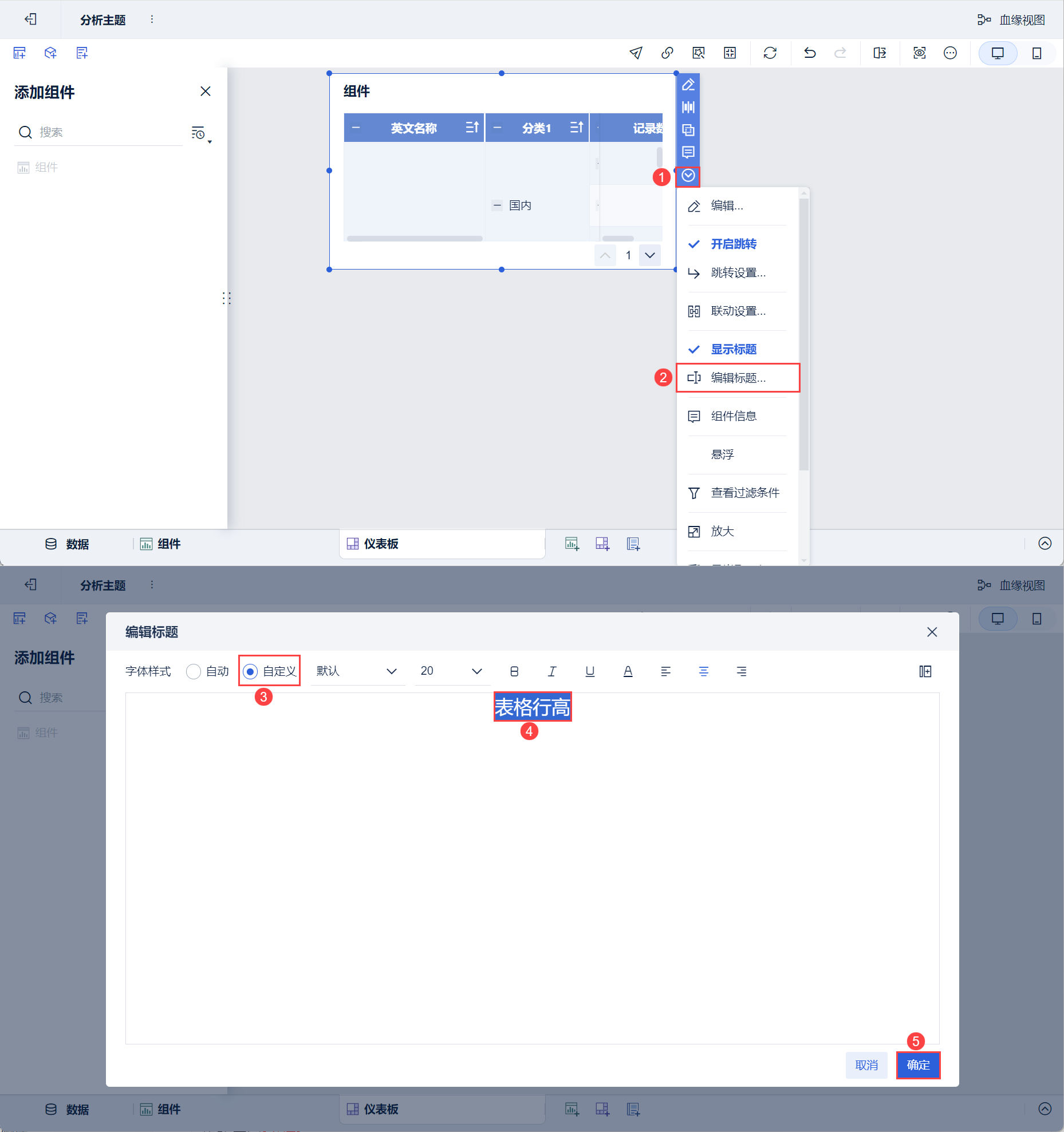 3)下拉选择「编辑标题」,样式选择「自定义」,设置标题为「表格行高」,点击「确定」。如下图所示: