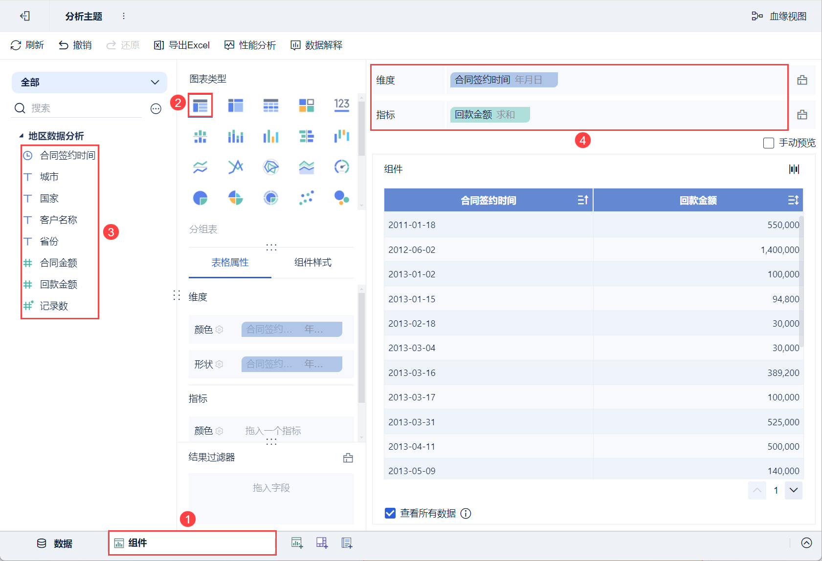 3)将左侧待分析区域的「合同签约时间」拖入维度栏,「回款金额」拖入指标栏,如下图所示: