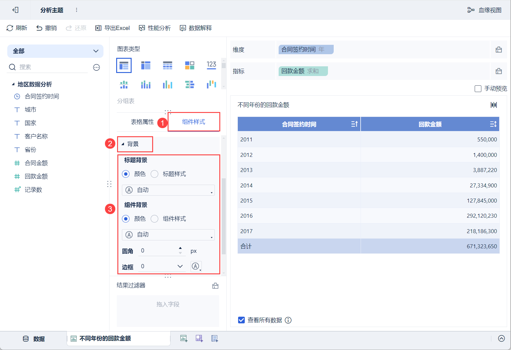FineBI 支持对组件的标题背景、组件背景进行自定义设置。