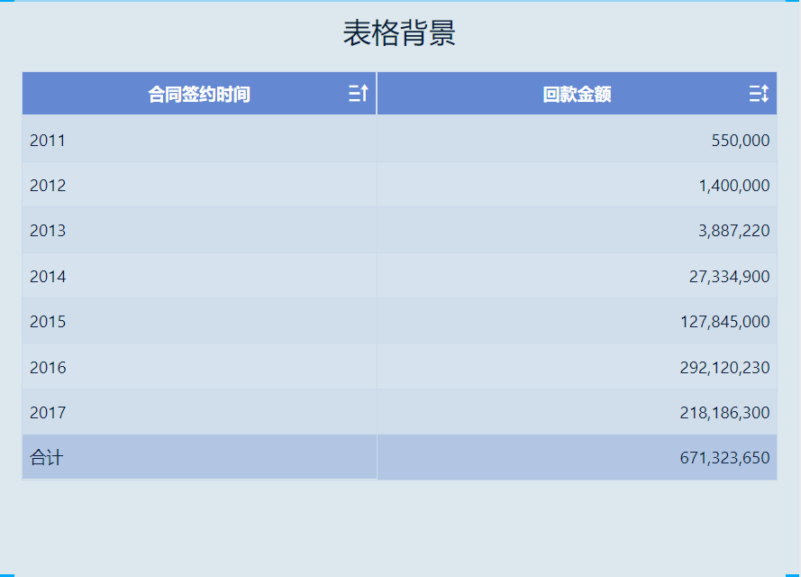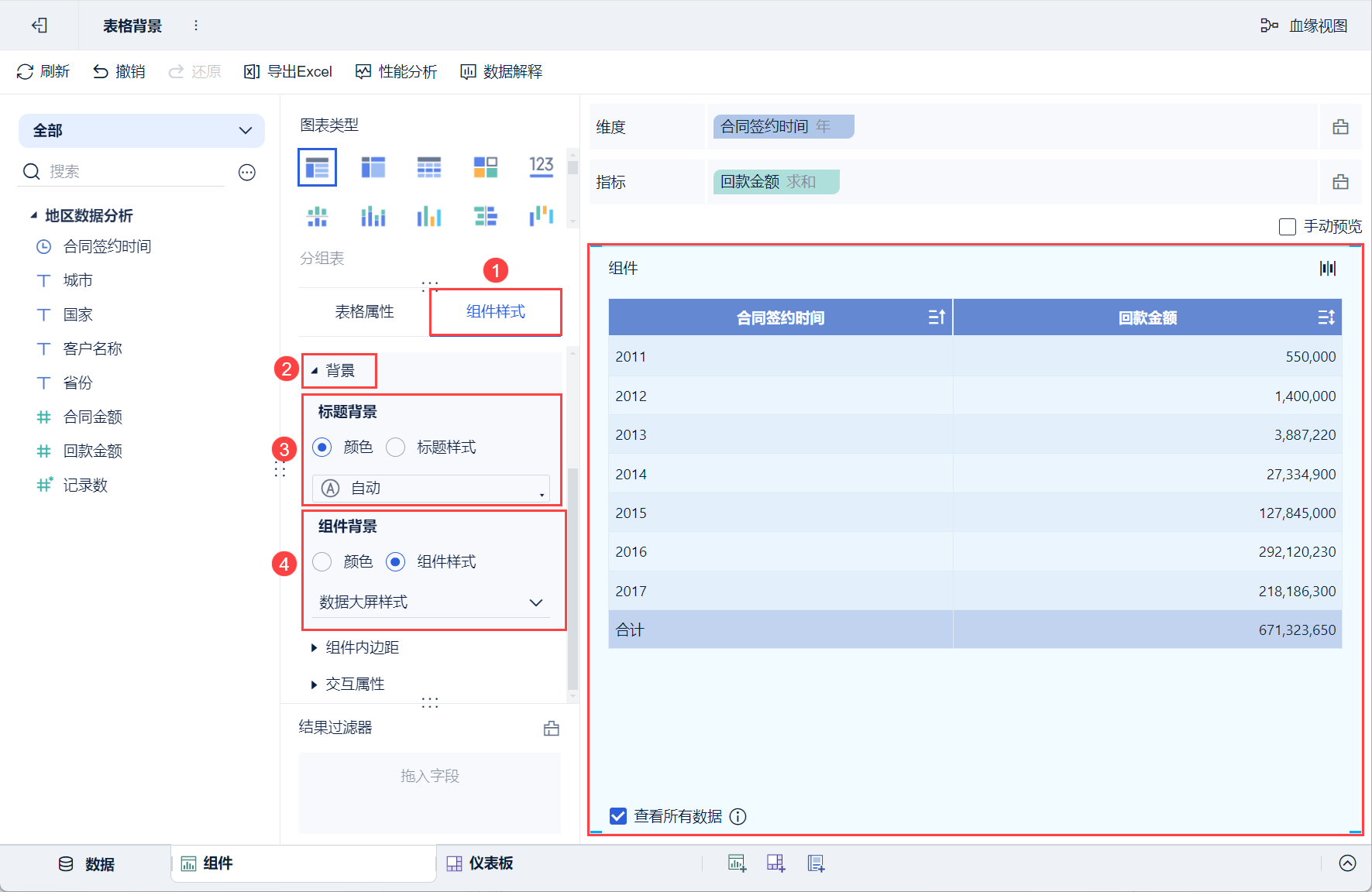设置表格的标题背景为「自动」颜色,组件背景为数据大屏样式。