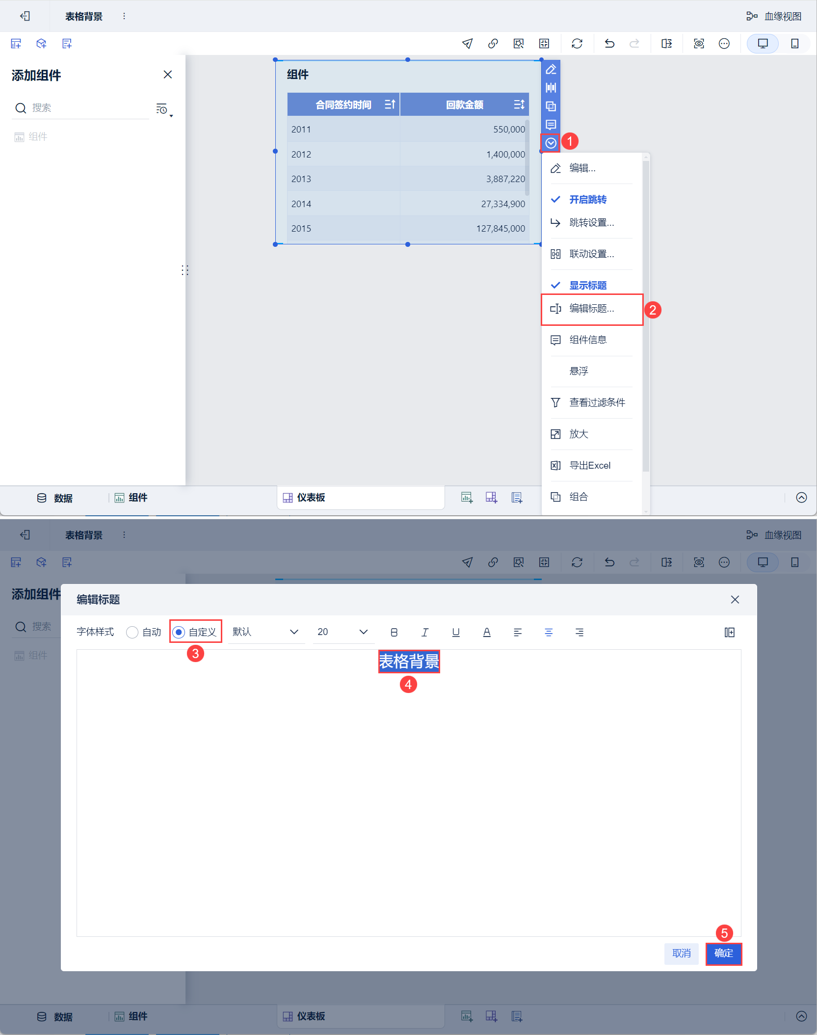3)下拉选择「编辑标题」,样式选择「自定义」,设置标题为「表格背景」,点击「确定」。如下图所示:
