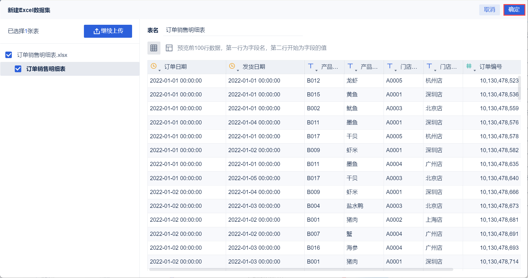 2)点击「本地Excel文件>上传数据」,上传表数据。如下图所示: