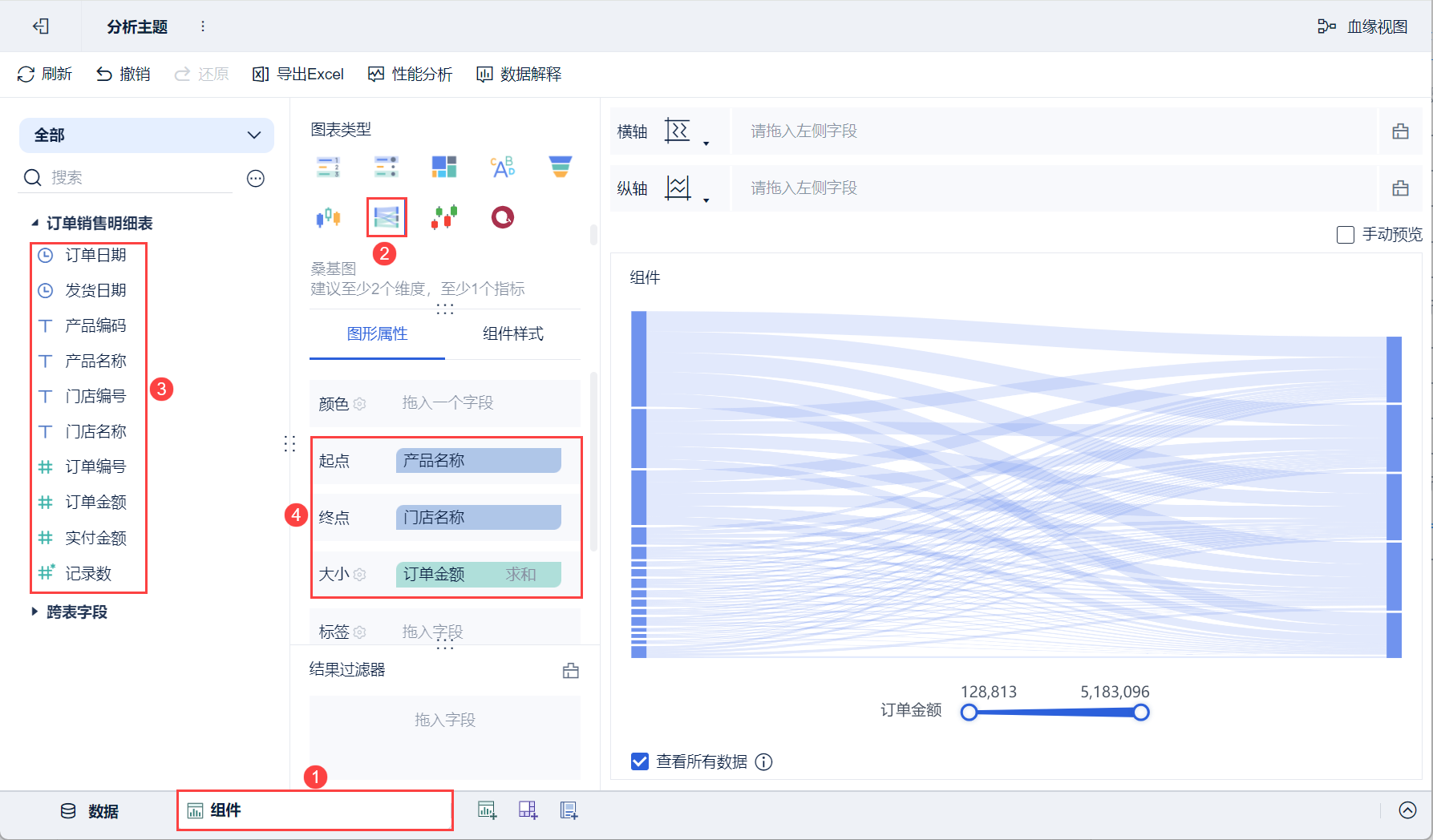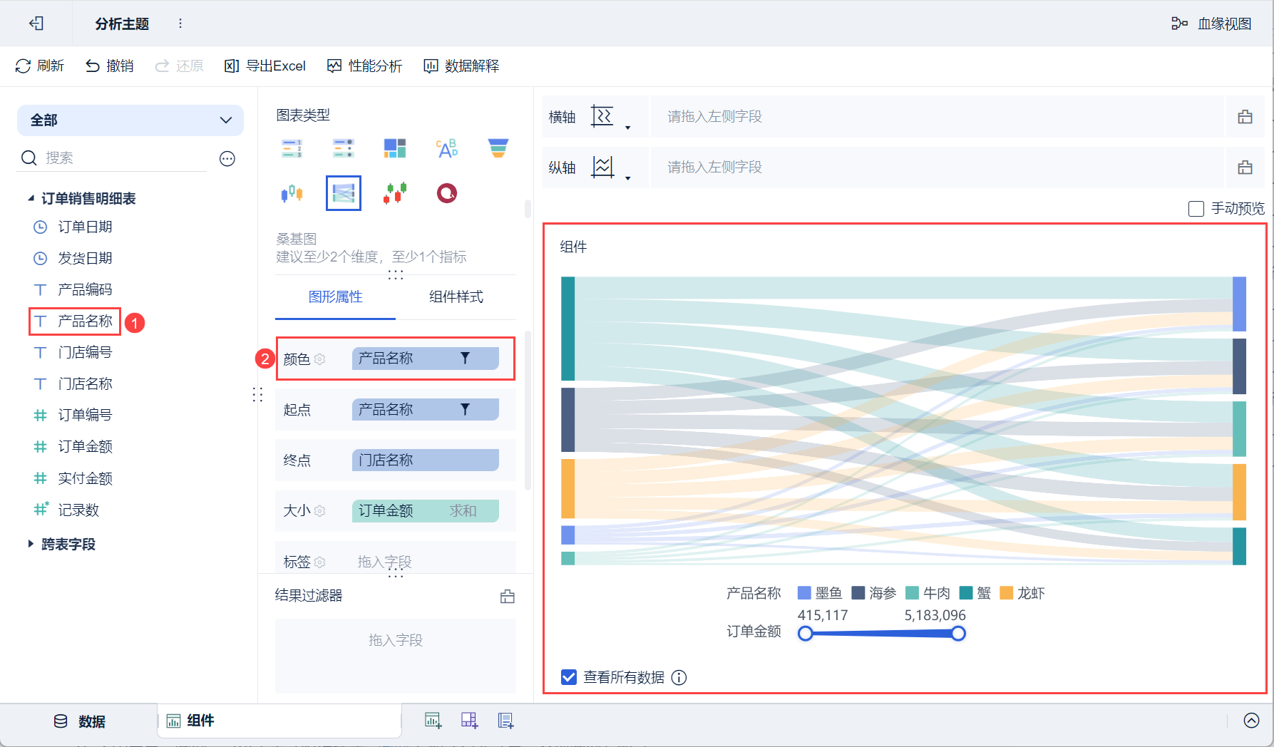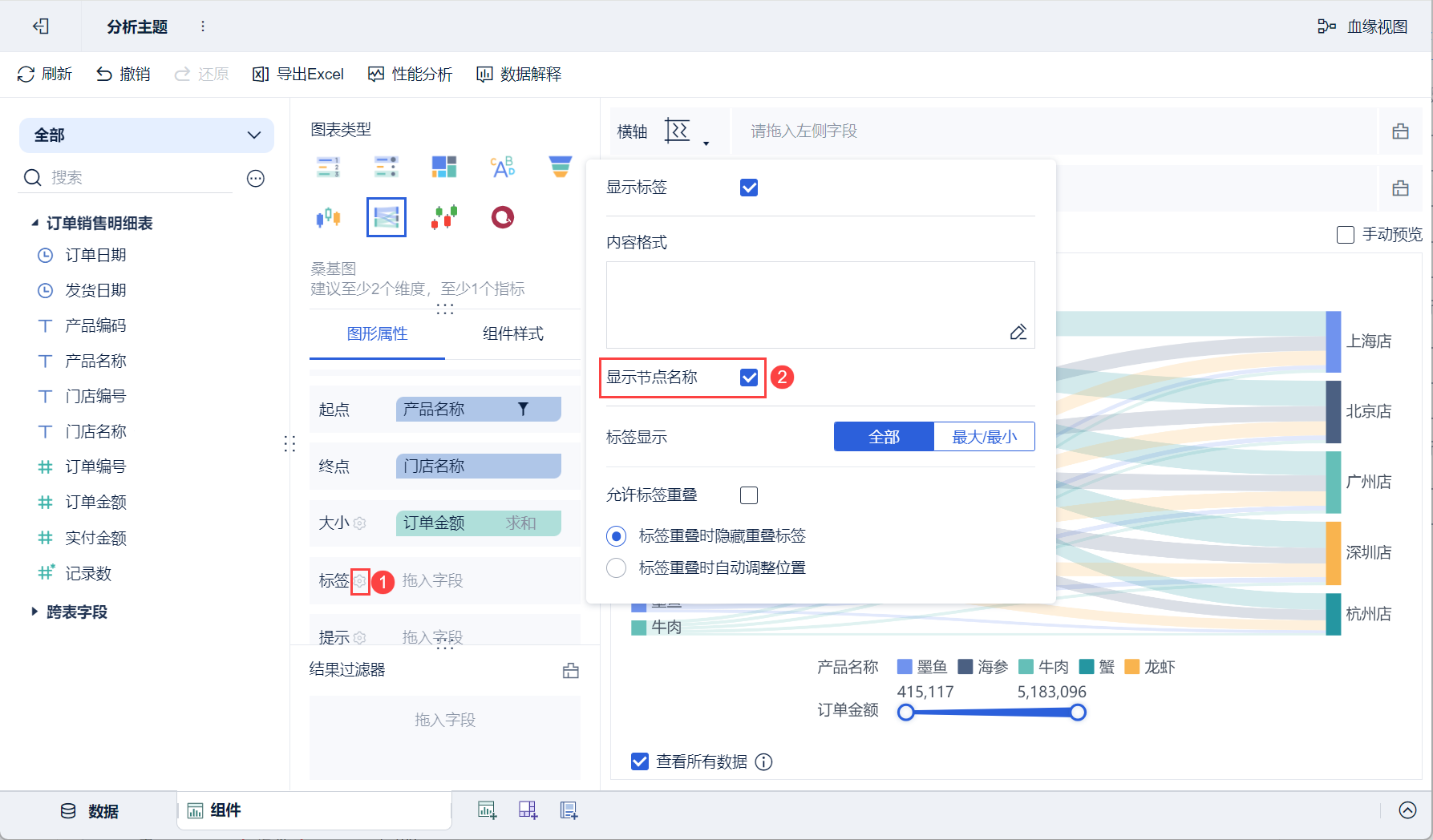 3)将左侧待分析区域的「产品名称」拖入「图形属性」下的起点栏,「门店名称」字段拖入到终点栏,「订单金额」字段拖入到大小栏,如下图所示: