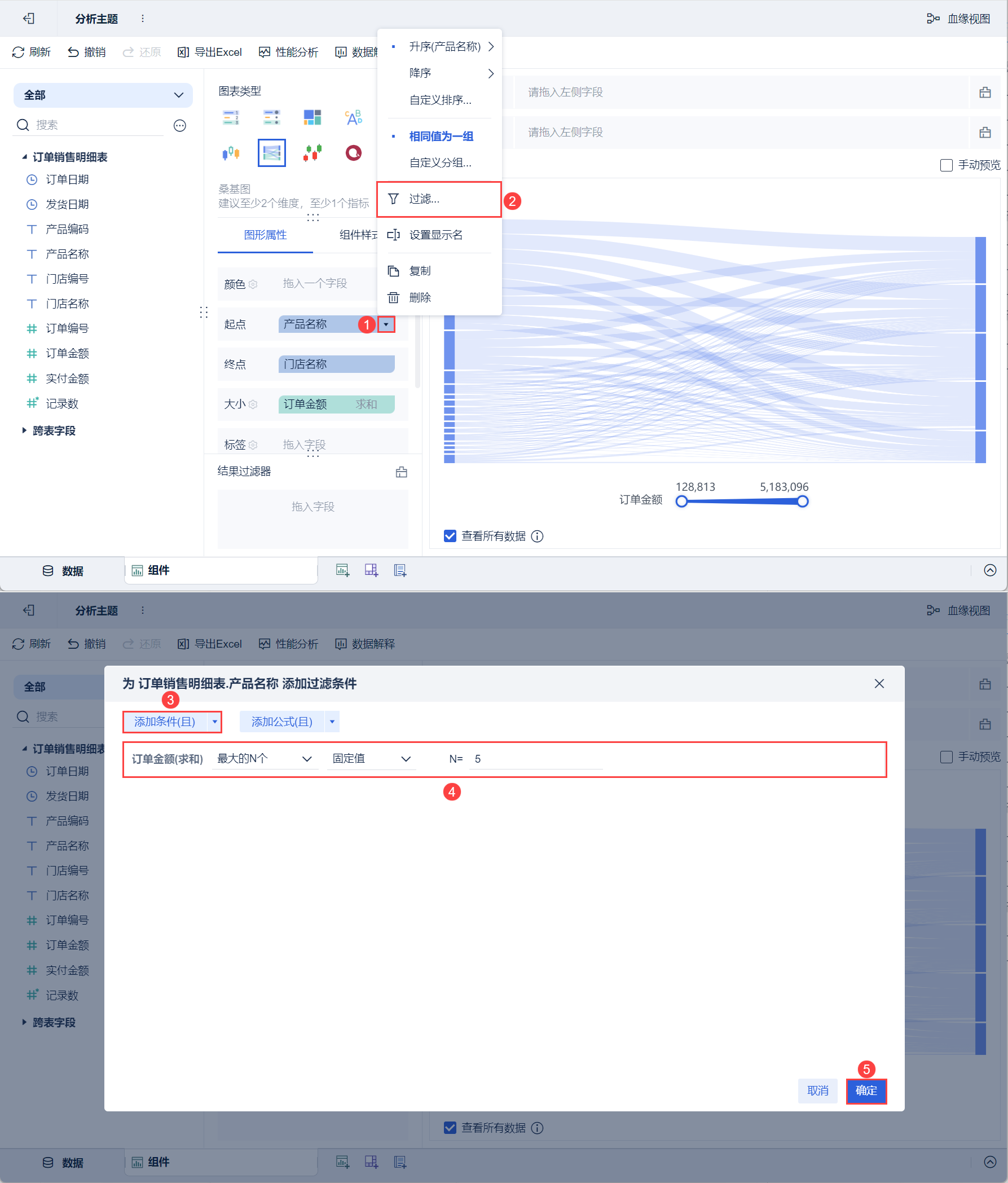 4)点击起点栏「产品名称」的下拉按钮,选择「过滤」,在弹出的设置框中添加过滤条件,筛选出订单金额最大的5个产品,如下图所示: