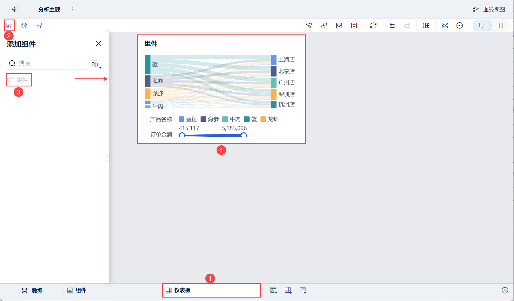 1)点击分析主题编辑界面下方添加仪表板。