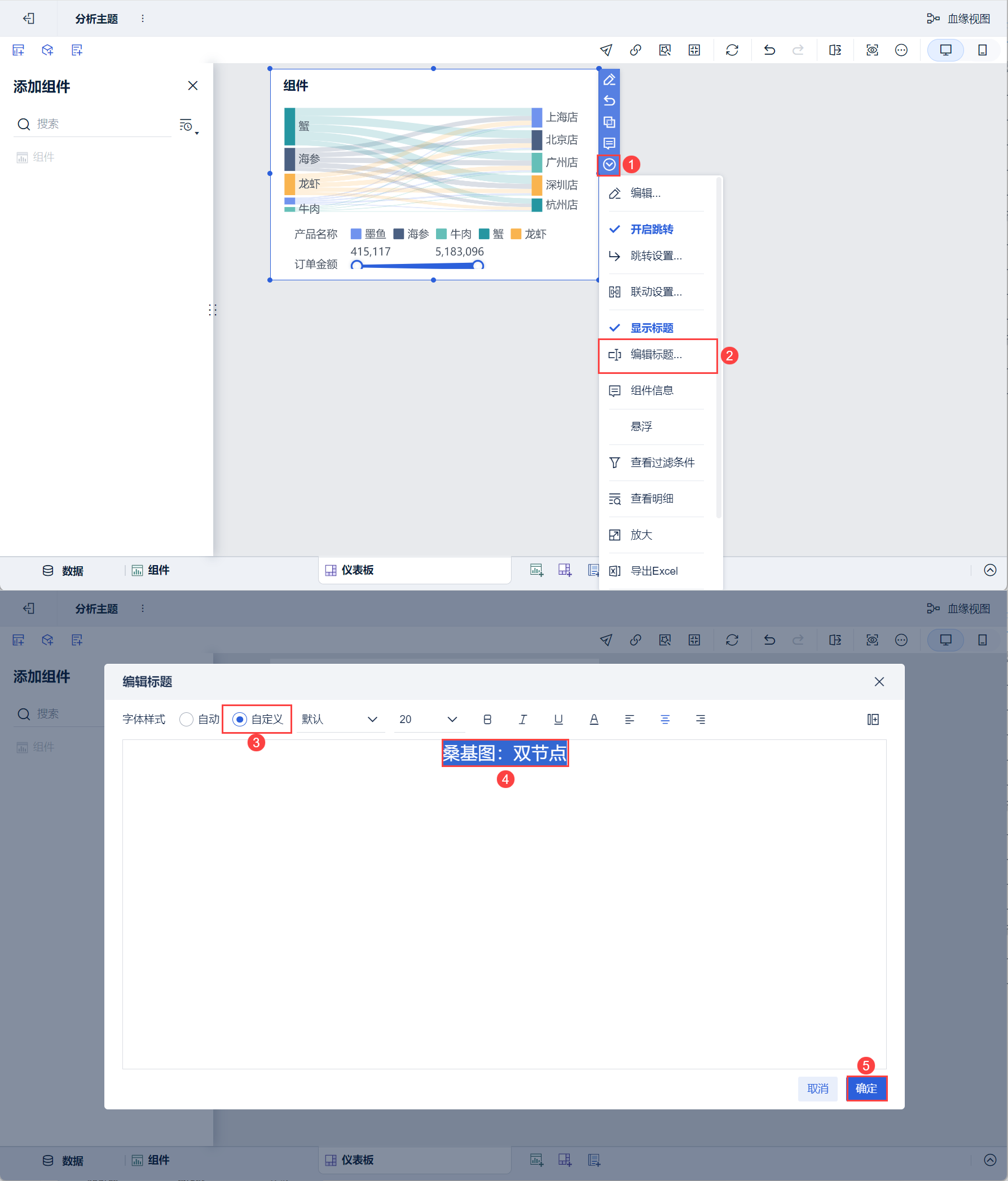 3)下拉选择「编辑标题」,样式选择「自定义」,设置标题为「桑基图:双节点」,点击「确定」。如下图所示: