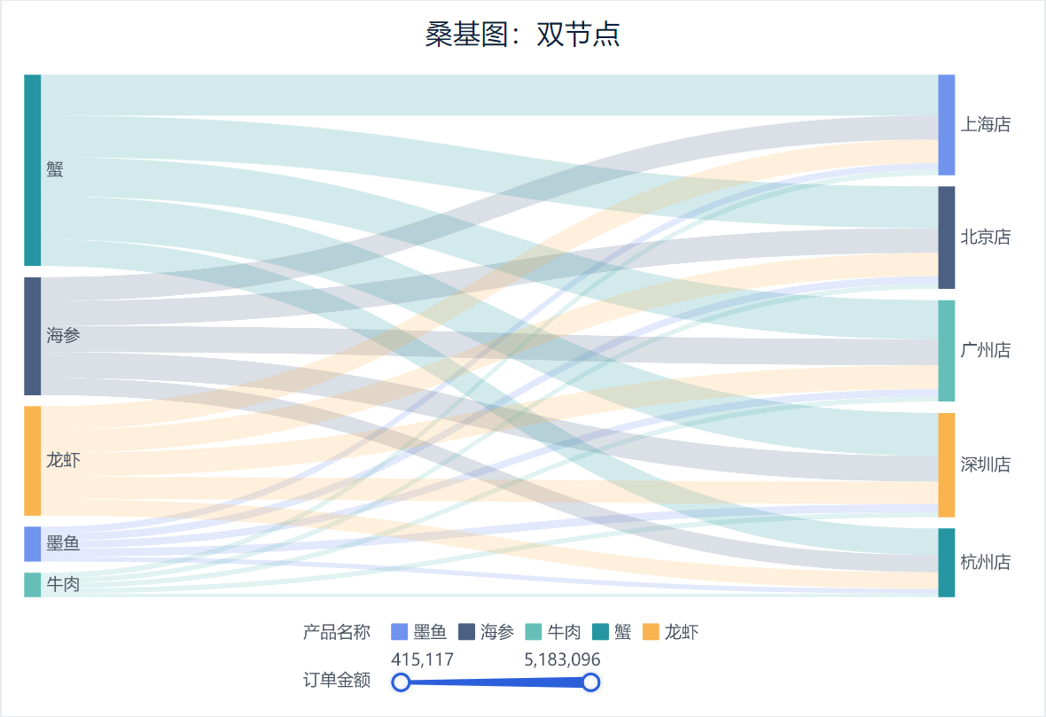 现在想分析一下销售最好的5款海鲜是哪几个,都是在哪些门店卖出去的。我们通过桑基图,能看到每个产品,流向的门店,线的粗细,代表流向的多少。如下图所示: