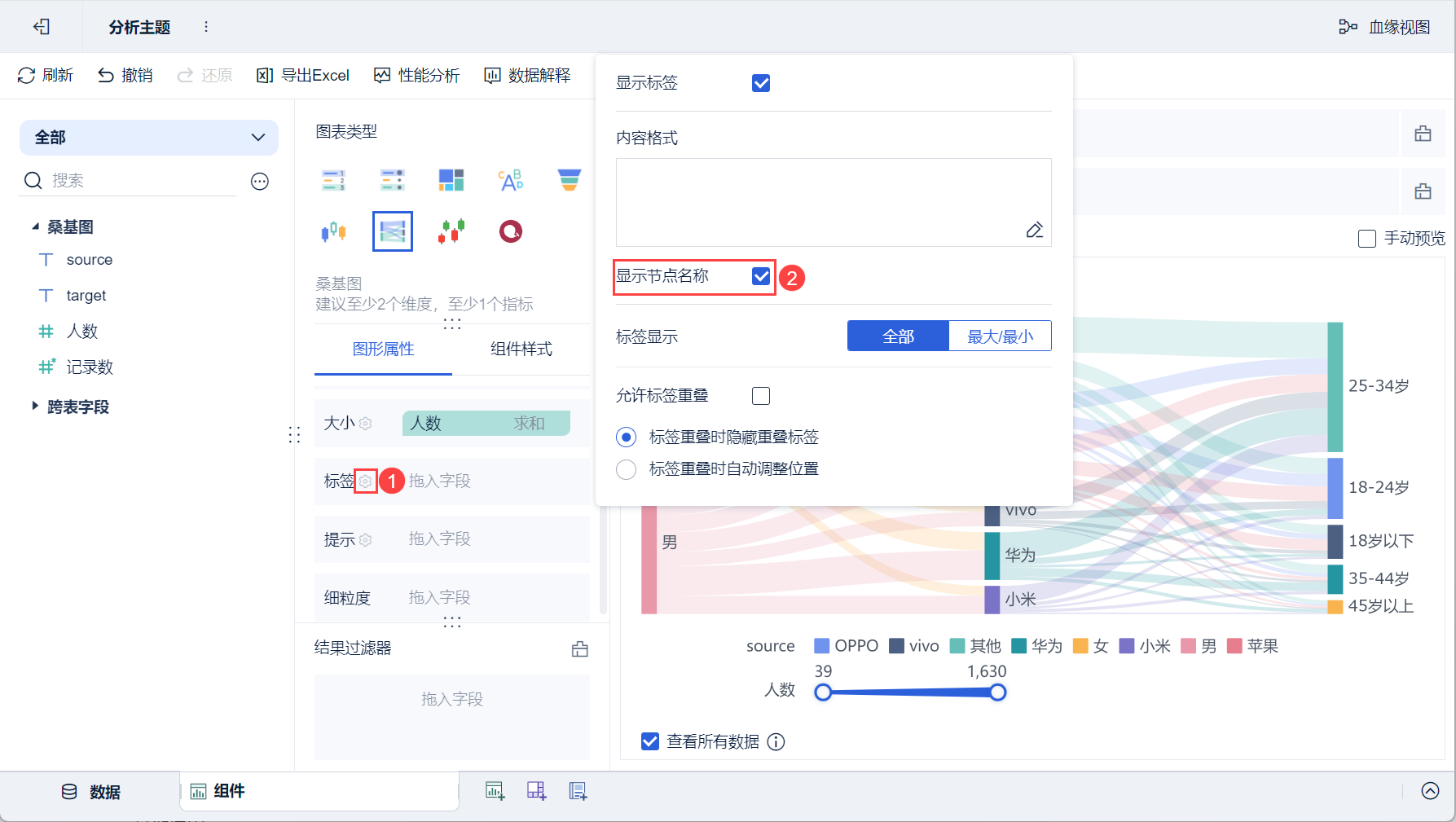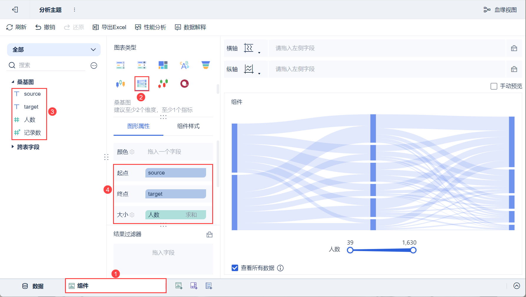 3)将左侧待分析区域的「source」拖入「图形属性」下的起点栏,「target」字段拖入到终点栏,「人数」字段拖入到大小栏,如下图所示: