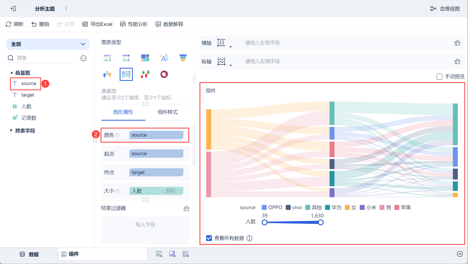 1)用不同颜色区分不同的产品流向。将左侧待分析区域的「source」字段拖入到「图形属性」下的颜色栏,如下图所示: