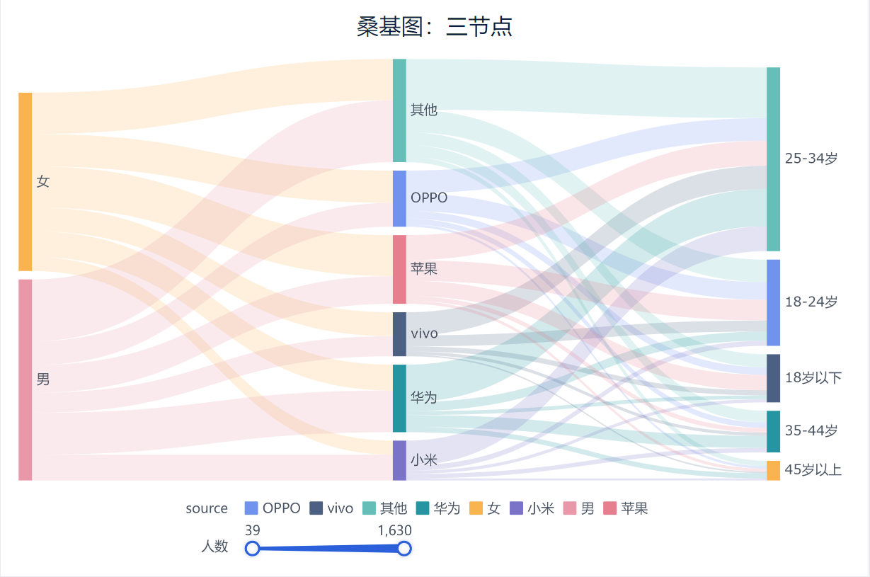 例如,使用此excel表制作桑基图,流向应该为「性别>使用的手机品牌>年龄」,手机品牌既是终点也是起点。