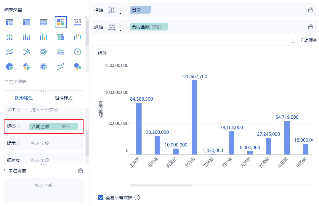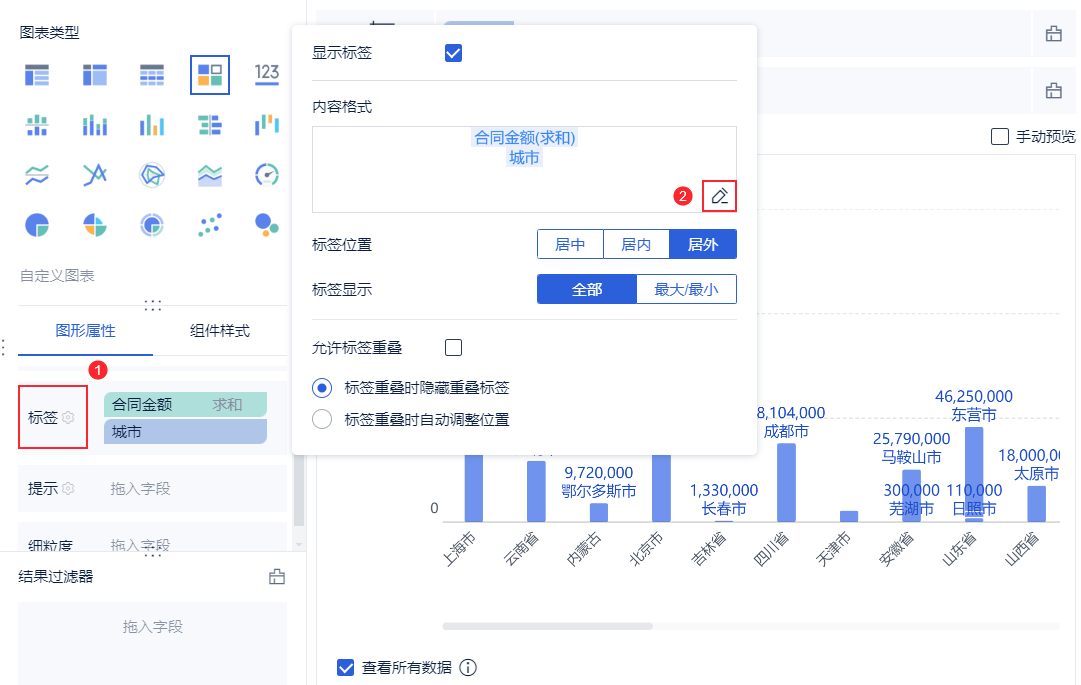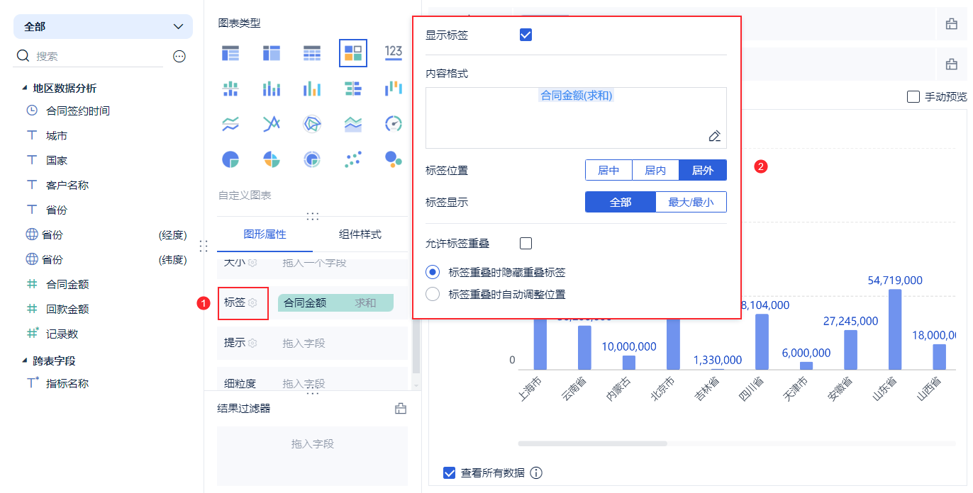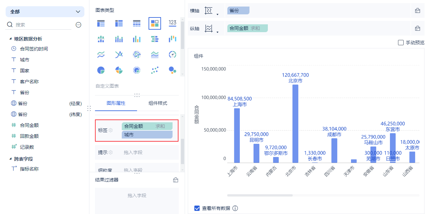 2)在「图形属性」下,点开「合同金额」字段,添加标签。如下图所示:
