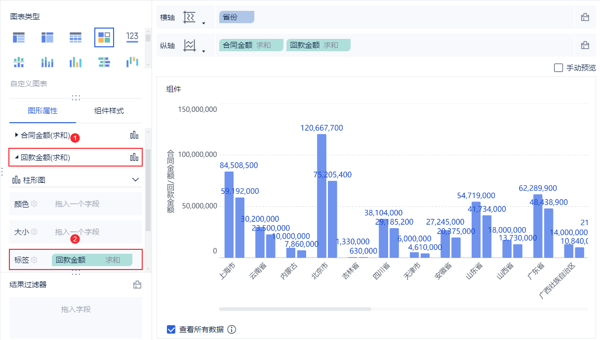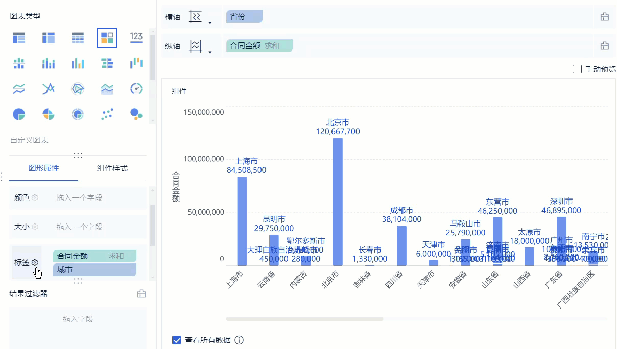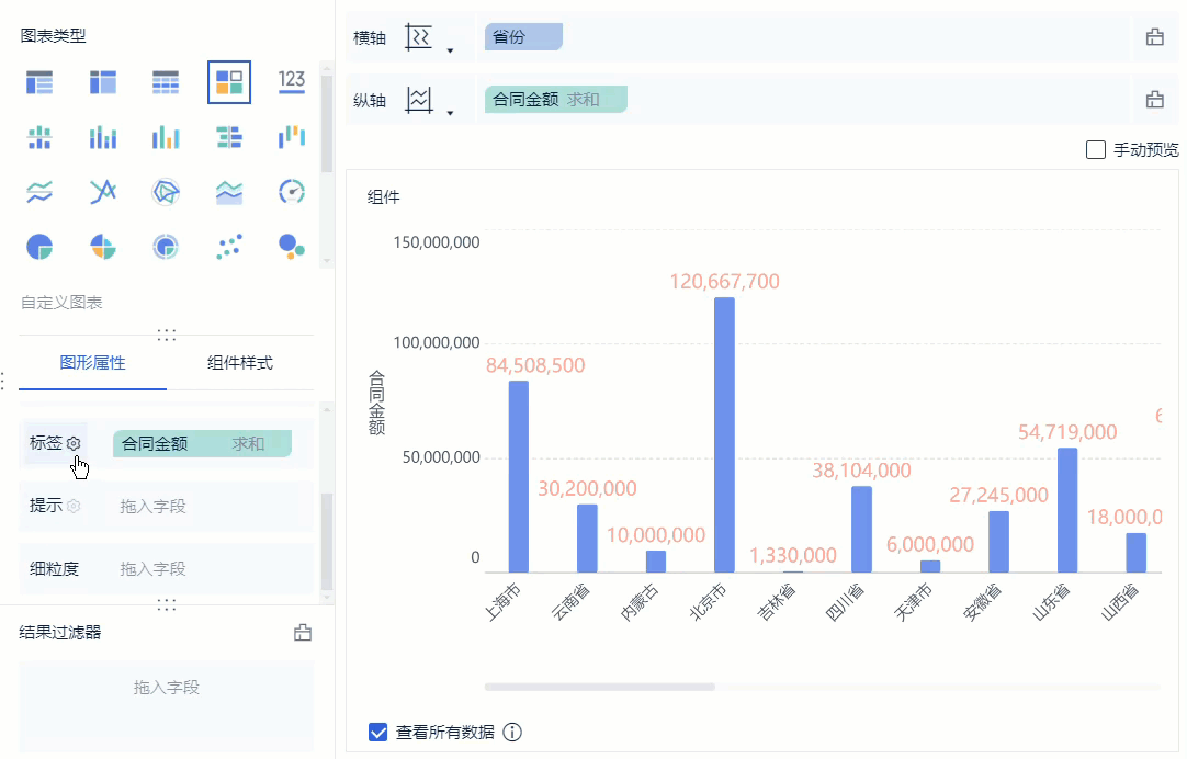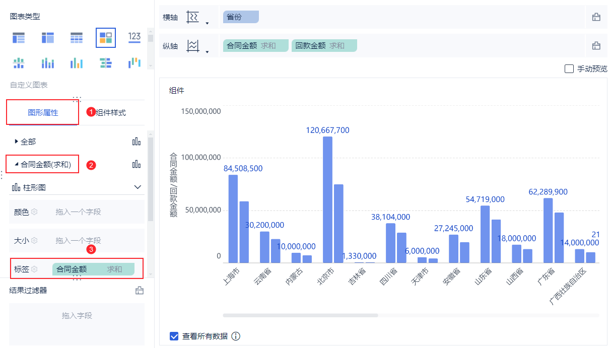 2)在「图形属性」下,点开「合同金额」字段,添加标签。如下图所示: