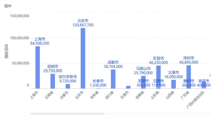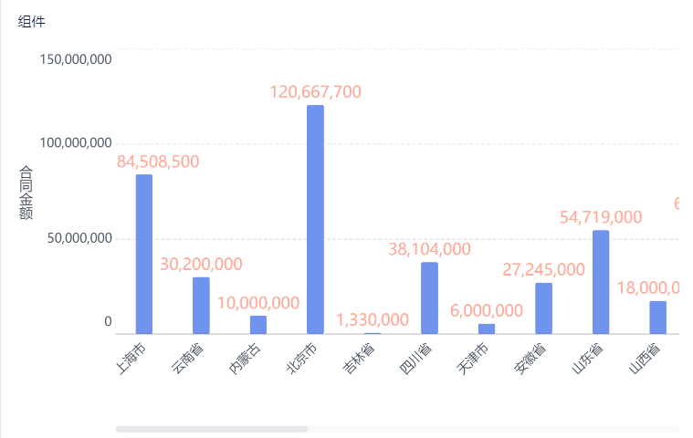 1)将「合同金额」拖入标签栏,柱形图上将显示合同金额的数值。如下图所示: