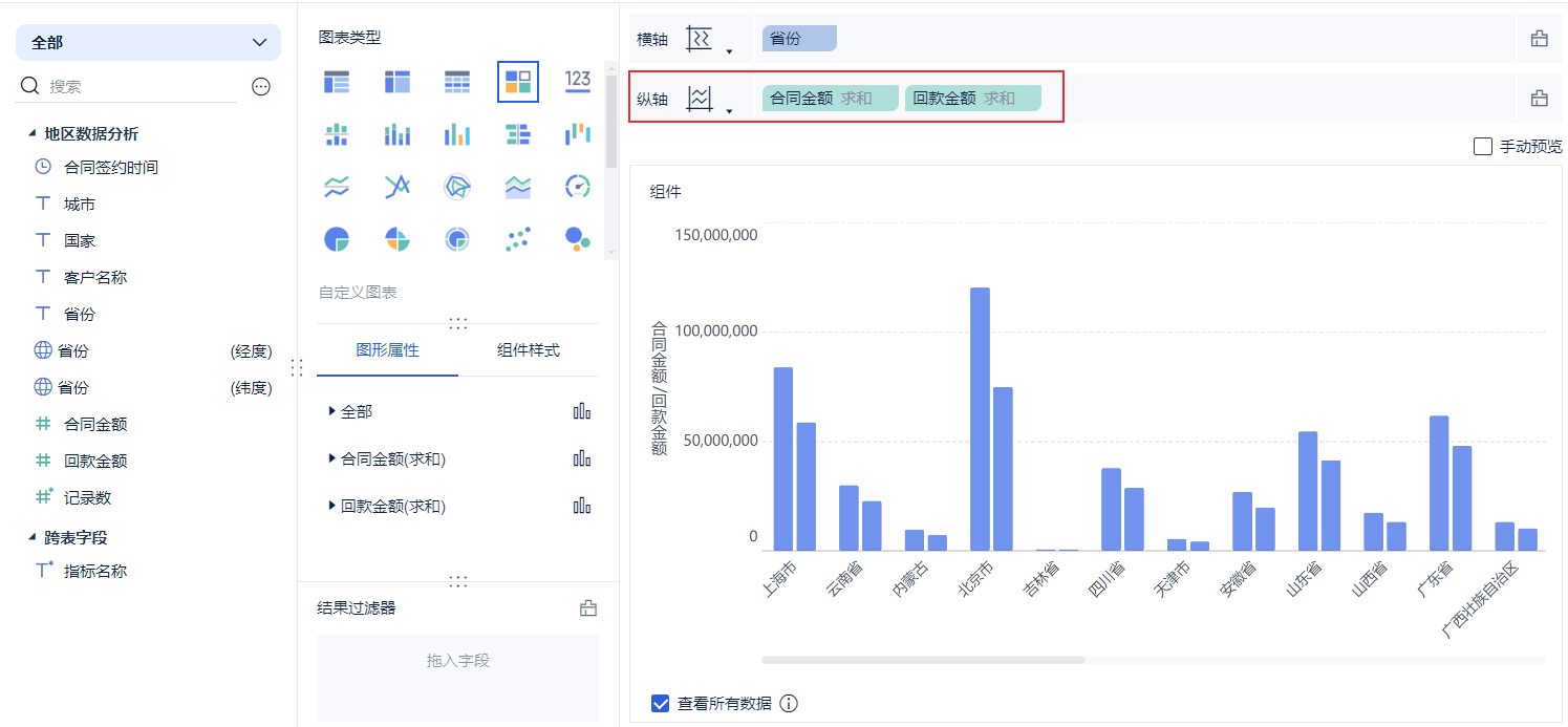 1)将「回款金额」字段拖入到纵轴中。如下图所示: