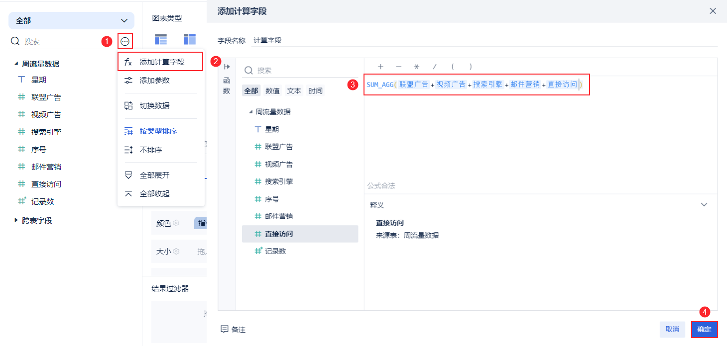 1)添加一个计算字段,值为sum_agg(指标1+指标2+指标3+......),sum_agg 介绍请参见:SUM_AGG-求和 。如下图所示: