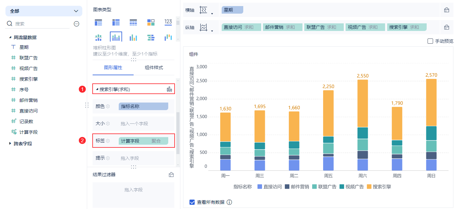 将维度/指标字段拖入标签栏,可以在图表上显示标签。