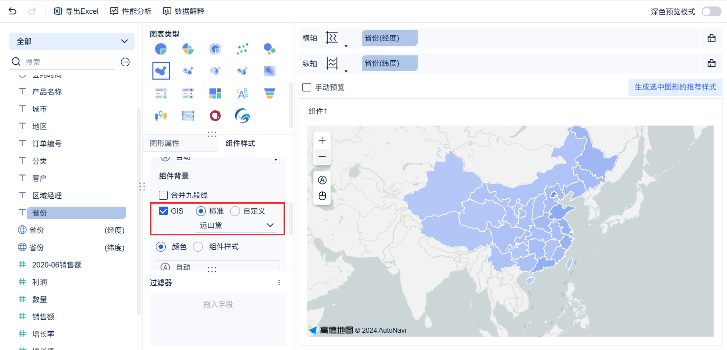 不勾选 GIS:直接使用「组件背景颜色」作为地图背景,组件背景颜色支持设置为透明