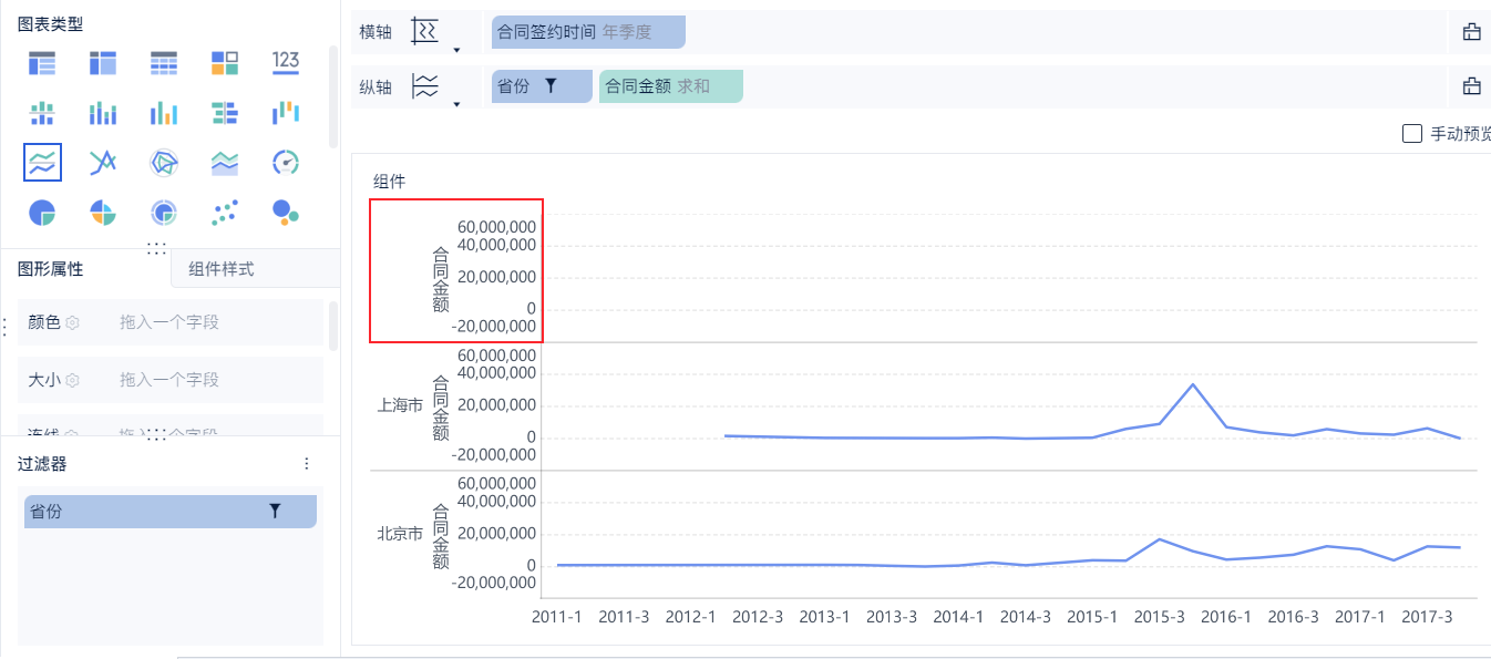例如省份只筛选出「北京、上海」,打开「显示缺失时间」后,图表重会出现第三行空维度。如下图所示: