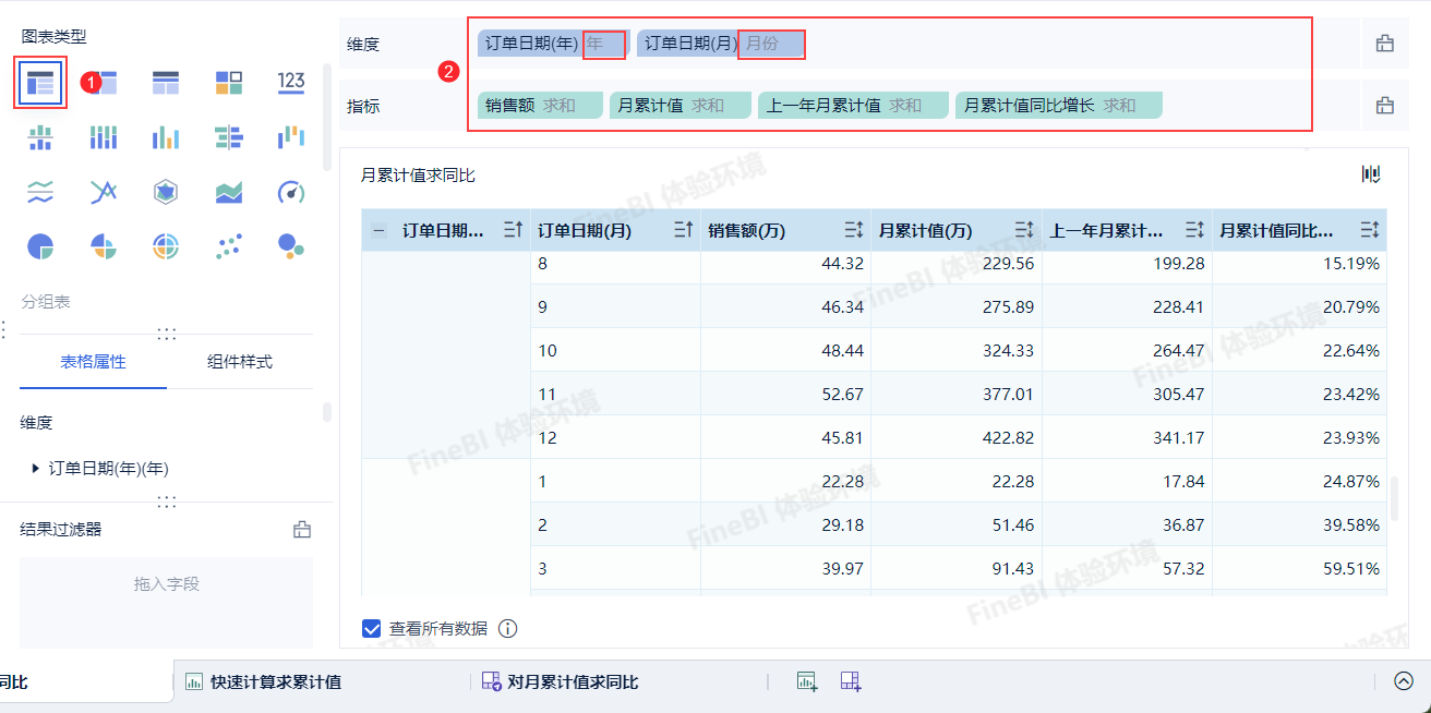 在不使用 DEF 函数的时候,我们可以通过 BI 的快速计算,得出每年的销售额月累计值。