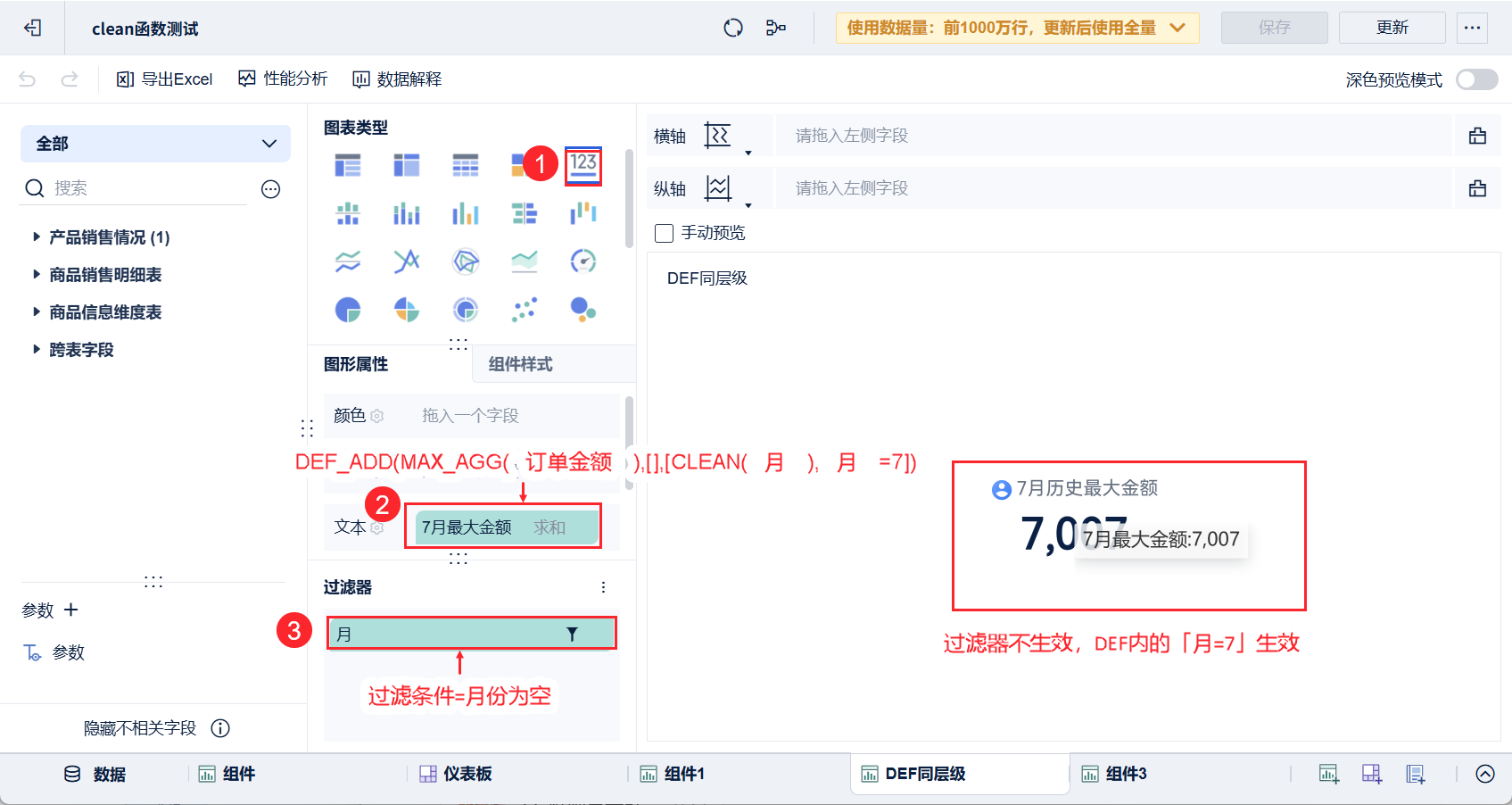 例如,def(sum_agg(订单金额),[],[ clean(月),月=7]),过滤器绑定「月」过滤 ,此时,DEF 计算仅使用「月=7」进行过滤。