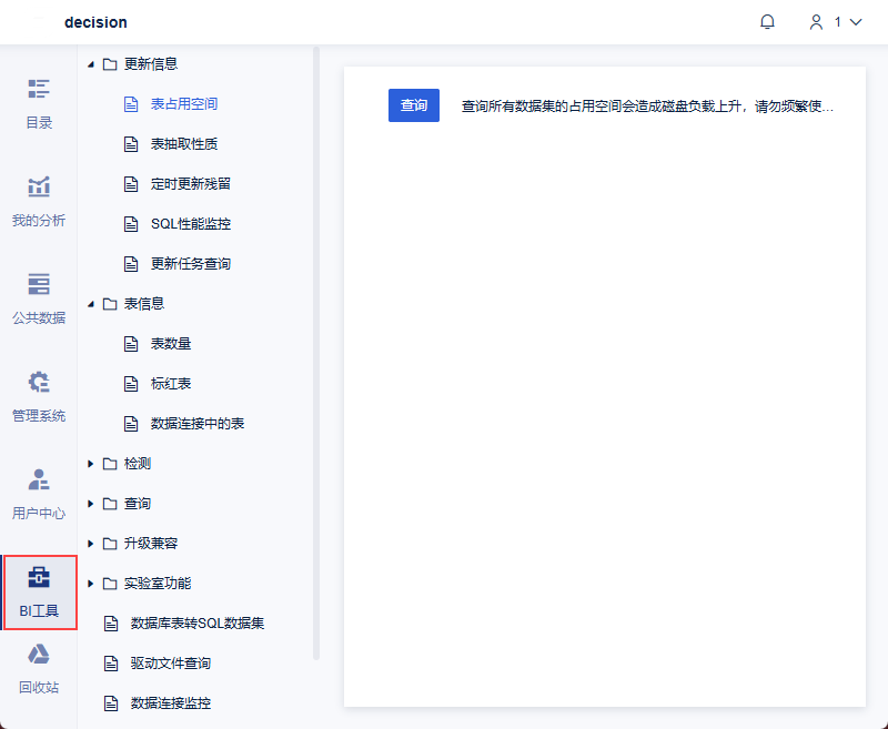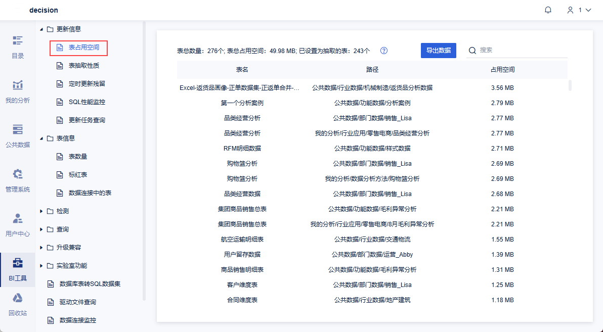 支持查询并导出FineBI工程中表的占用空间,如下图所示: