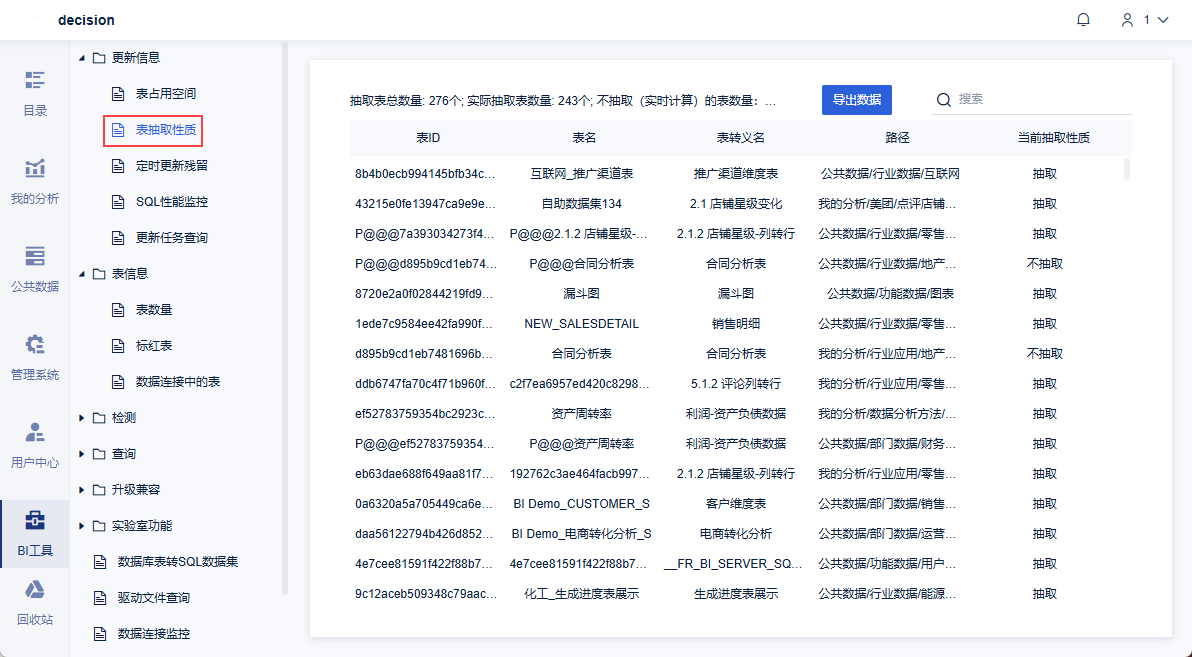 明细表显示:表ID、表名、表转义名、路径、表性质(抽取/不抽取)