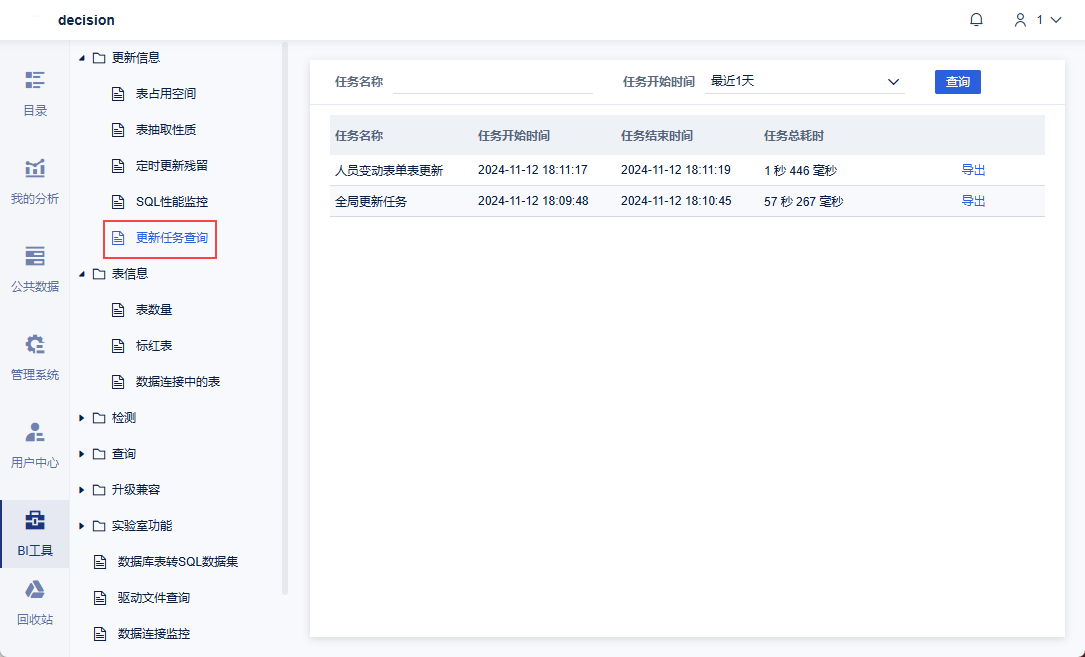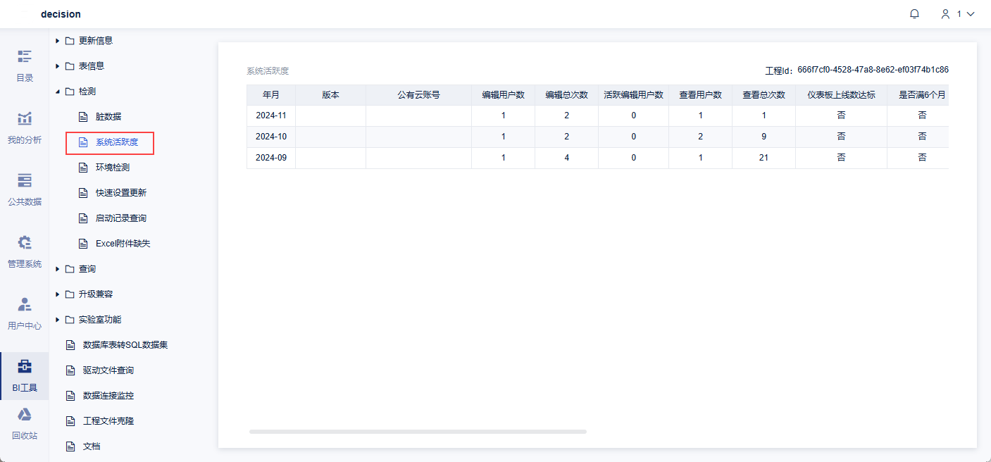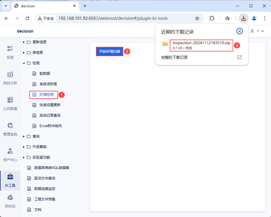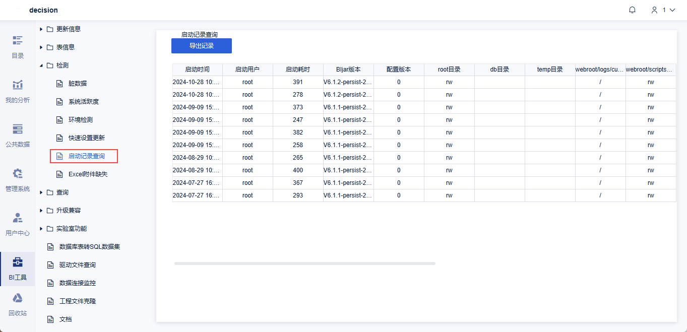 环境检测功能,检测内容包括:系统环境信息、BI工程信息、jar包信息、工程目录文件、集群节点信息、抽取实时各类型表数量。