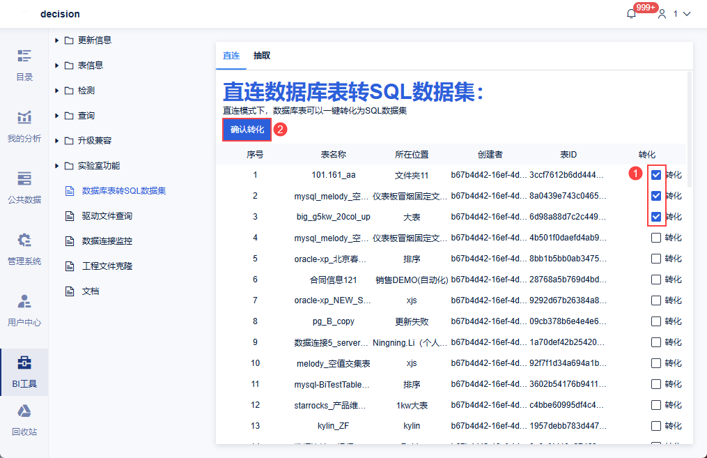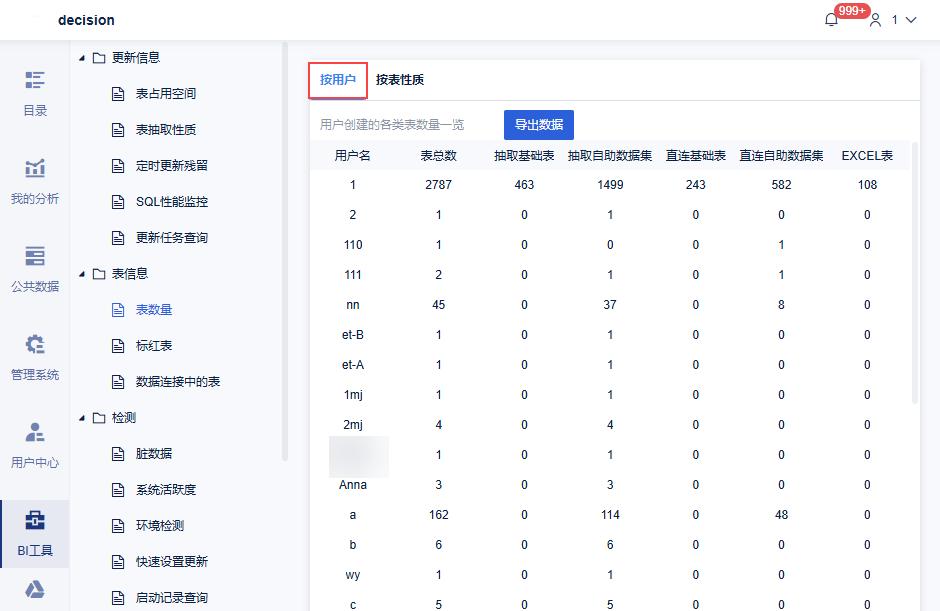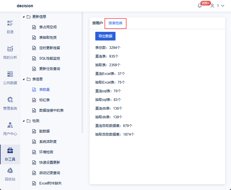 列举FineBI系统中各类(抽取、直连、基础表、自助分析)表数量。