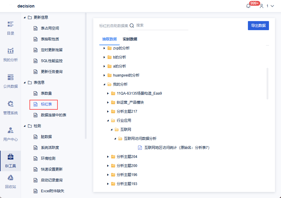 1)按照抽取/实时数据类型、用户的分析、文件夹、主题层级结构列举所有标红的自助数据集。