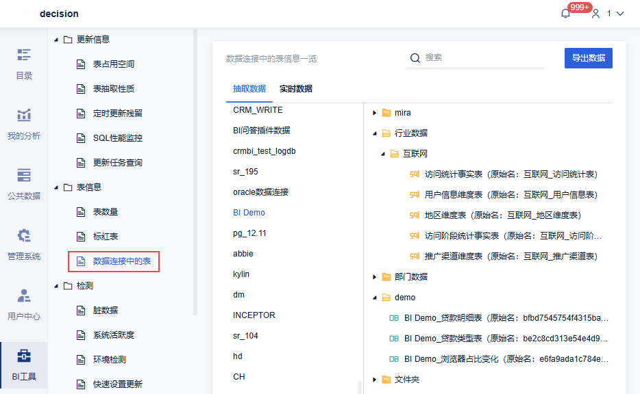 指标显示:抽取表总数量、实际抽取表数量、不抽取(实时计算)的表数量