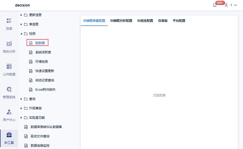 提供BI抽取准备配置、BI抽取分析配置、BI直连配置、仪表板、平台配置等部分脏数据删除入口。