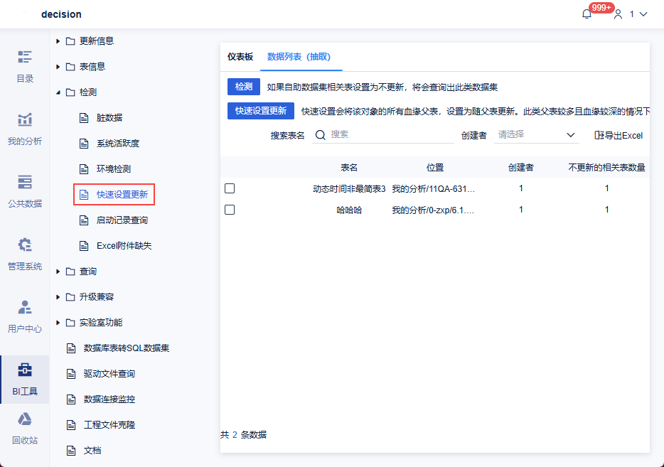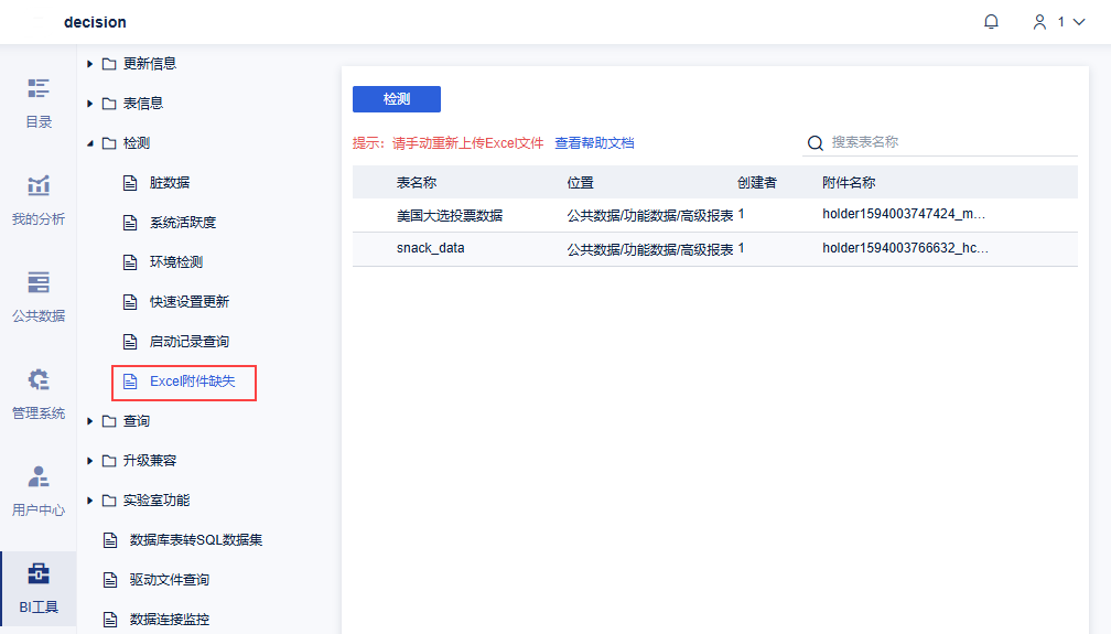 在 BI 升级或日常使用过程中,holder 文件夹中的 excel 附件会被误删或意外丢失,会导致excel数据集更新后无法复原。此时可使用Excel附件缺失功能进行检测。