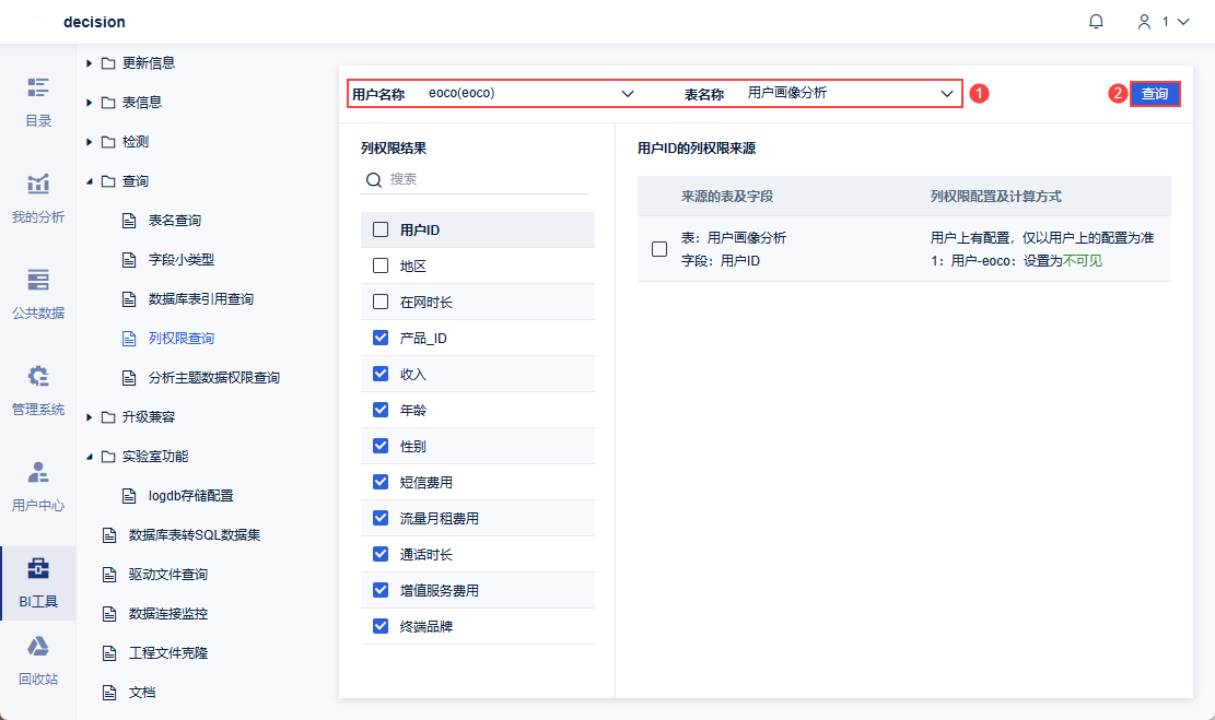 可查看指定用户对指定表的指定字段的列权限配置和计算方式。