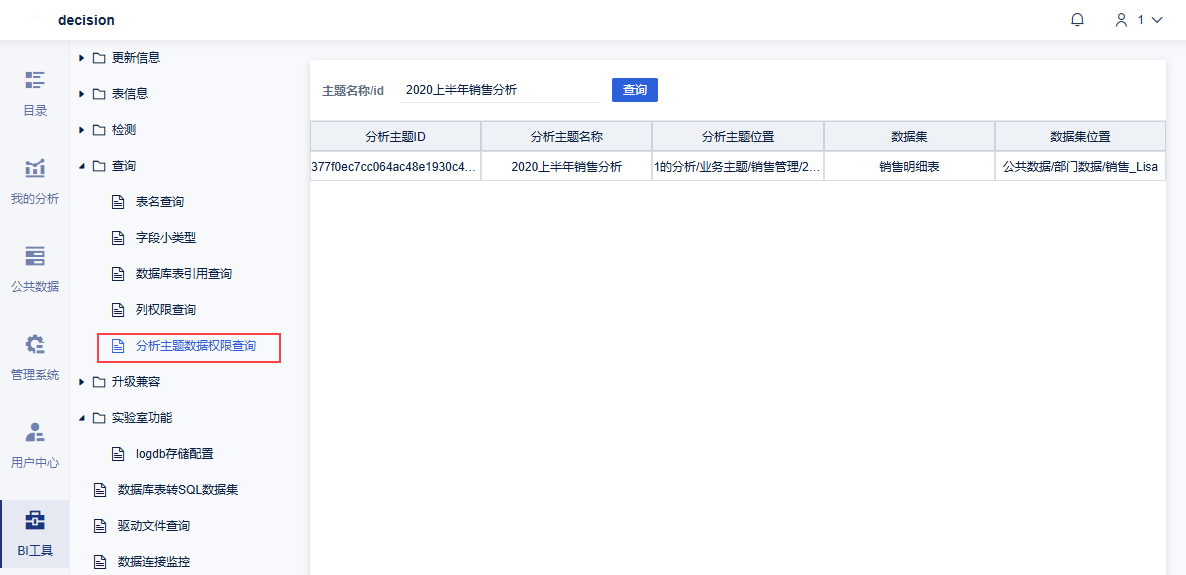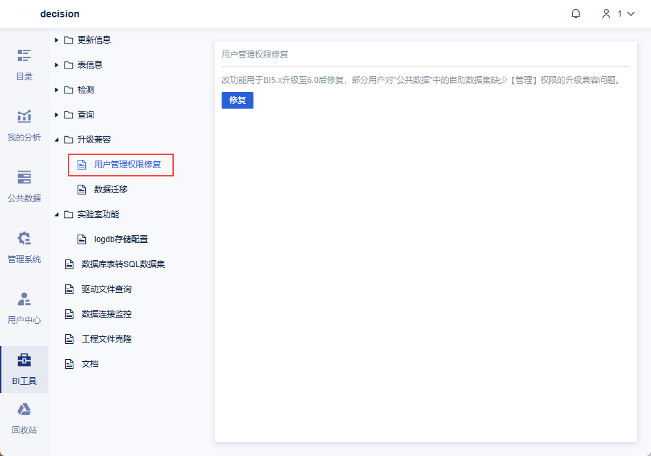 该功能用于BI5.x升级至6.0后,修复部分用户对「公共数据」中的自助数据集缺少「管理」权限的升级兼容问题。