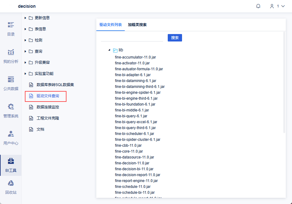 提供视图化展示FineBI工程,web-inf/lib文件夹、以及web-inf/驱动隔离文件夹。支持搜索加载类路径。