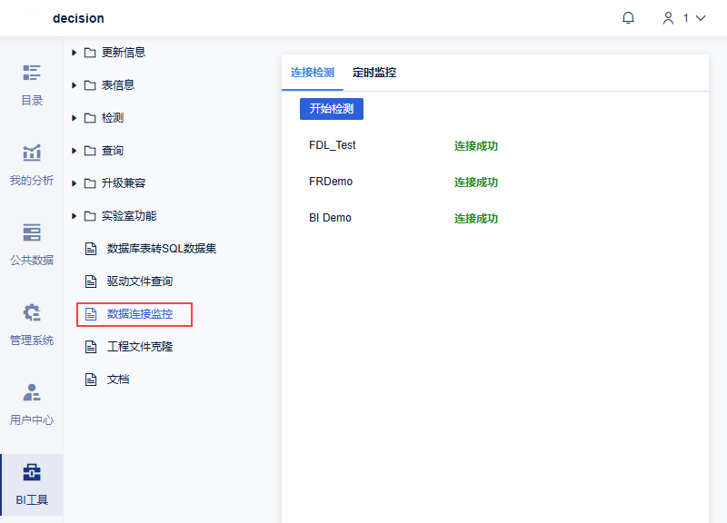 「连接检测」功能,支持手动一键检测系统下全部数据连接,用来辅助排查升级前后、或驱动隔离前后的数据连接问题。