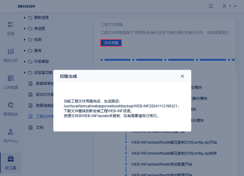 工程文件克隆是基于「管理系统-备份还原」功能中最近的备份文件,生成搭建测试工程时的必要文件。