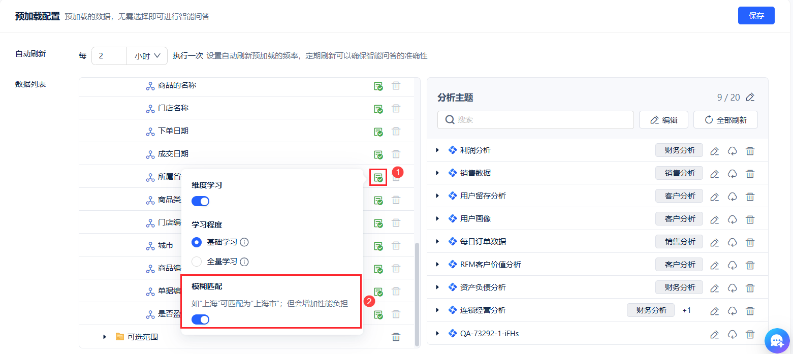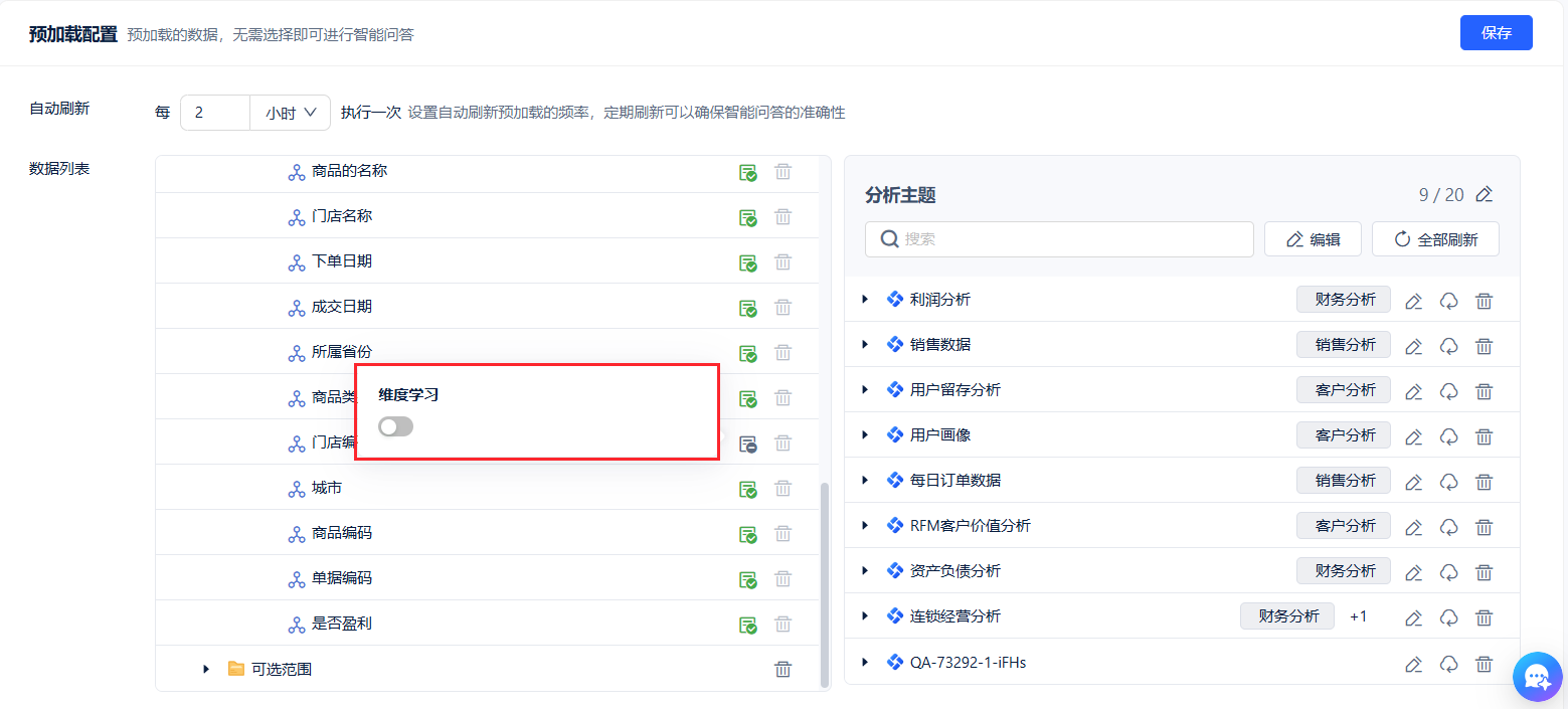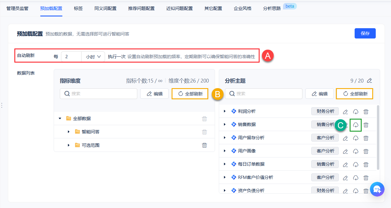 管理员通过预加载配置,将重要分析数据(比如核心业务指标等)提前加载到智能问答系统中。