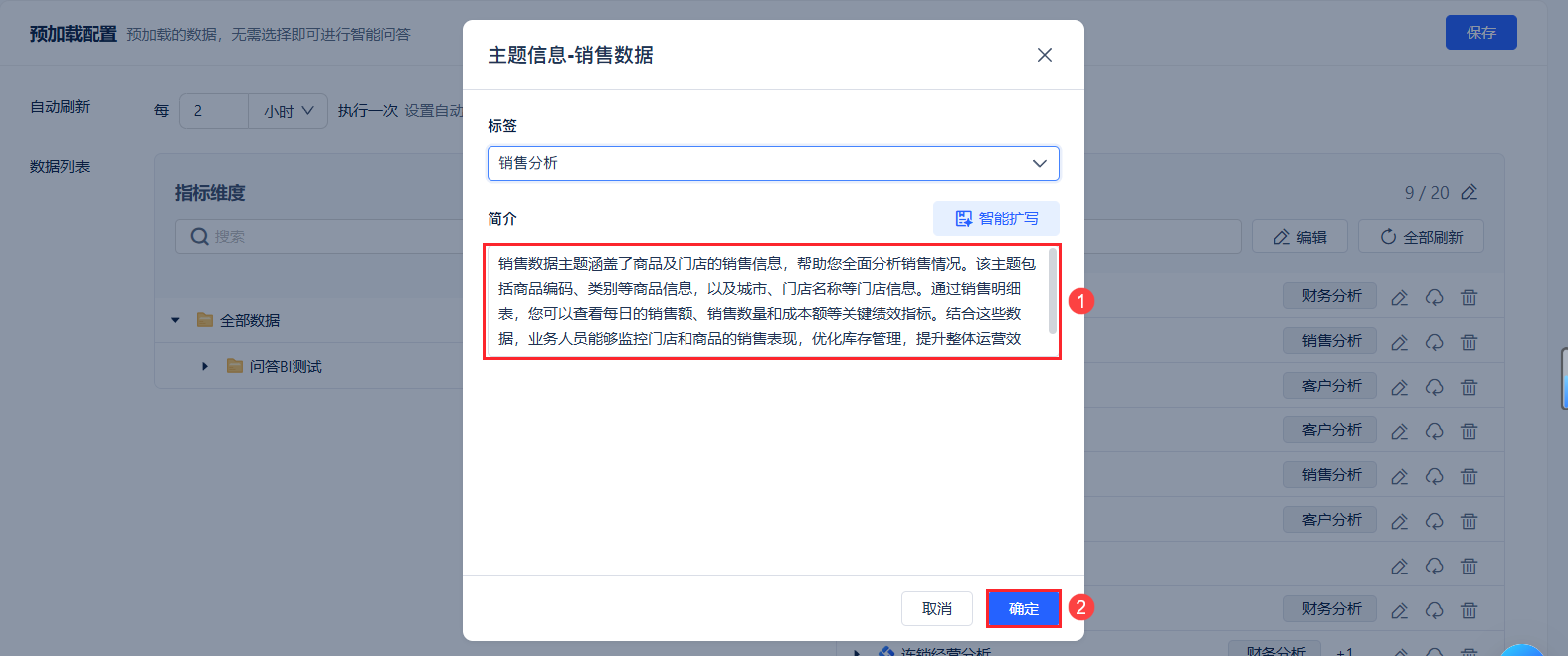 为分析主题增加描述信息,方便其他用户使用时了解主题,支持用户手动输入或者通过「智能扩写」生成。