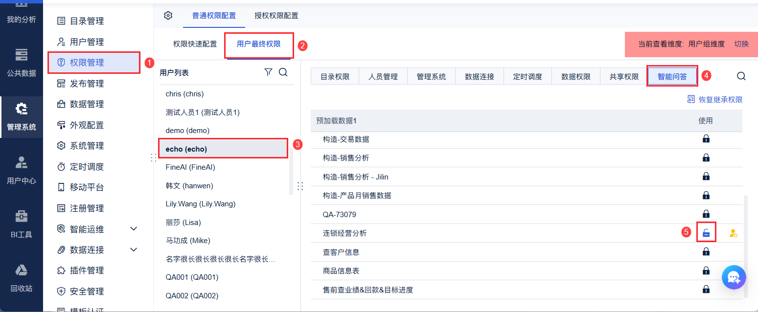 添加到预加载数据列表的分析主题,需要用户具备对应权限才能提问。以允许用户 echo 提问「连锁经营分析」为例: