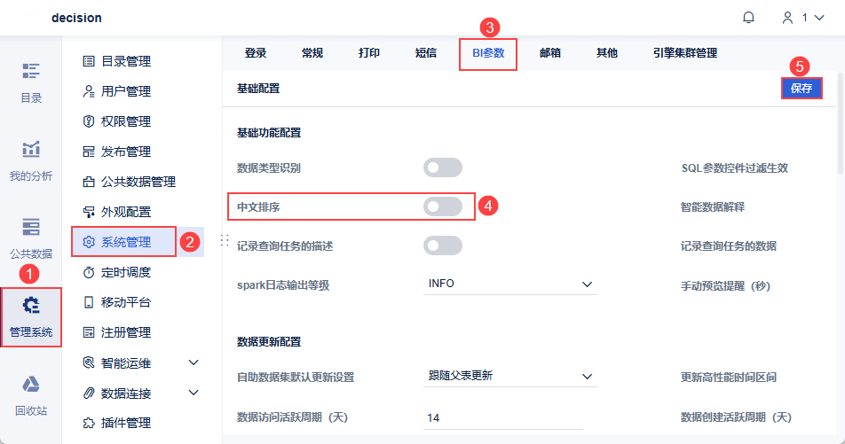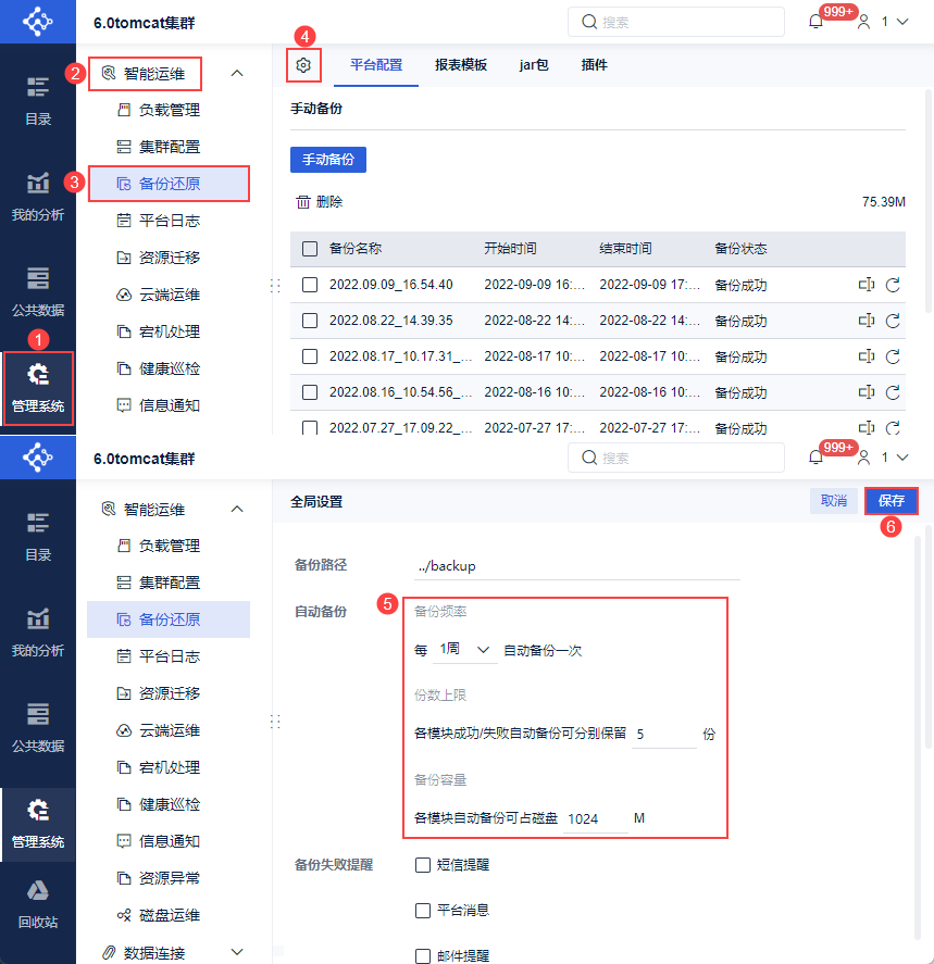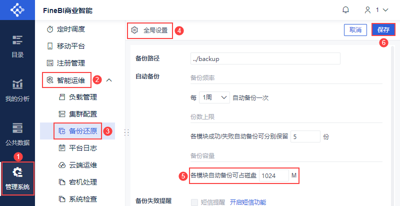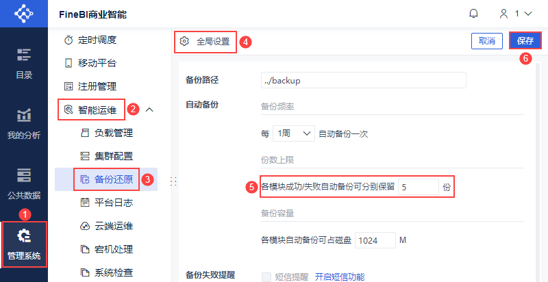 备份操作:管理员登录FineBI系统,点击「管理系统>智能运维>备份还原>全局设置」,开启自动备份。