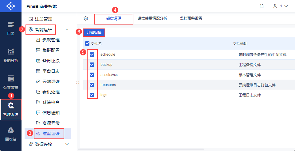 帆软提供磁盘运维功能,点击「管理系统>智能运维>磁盘运维」,其中「磁盘使用情况分析」Tab提供相应功能。